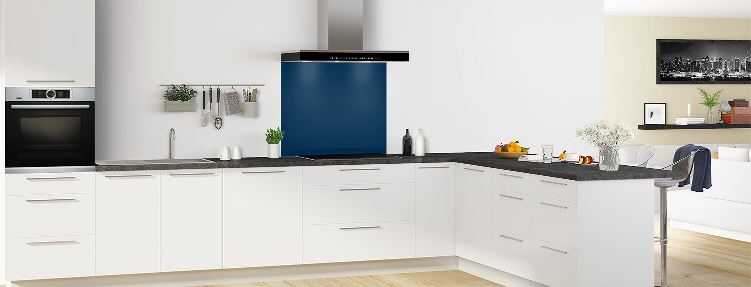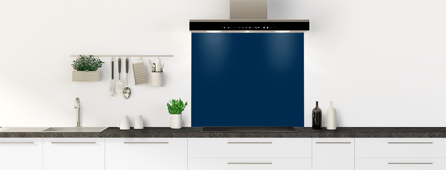 Fond de hotte couleur Bleu nuit, un bleu profond comme un fond de ciel étoilé, disponible en polycarbonate pour un rendu brillant ou en aluminium pour un rendu mat. À coller sur un carrelage ou sur tous supports.