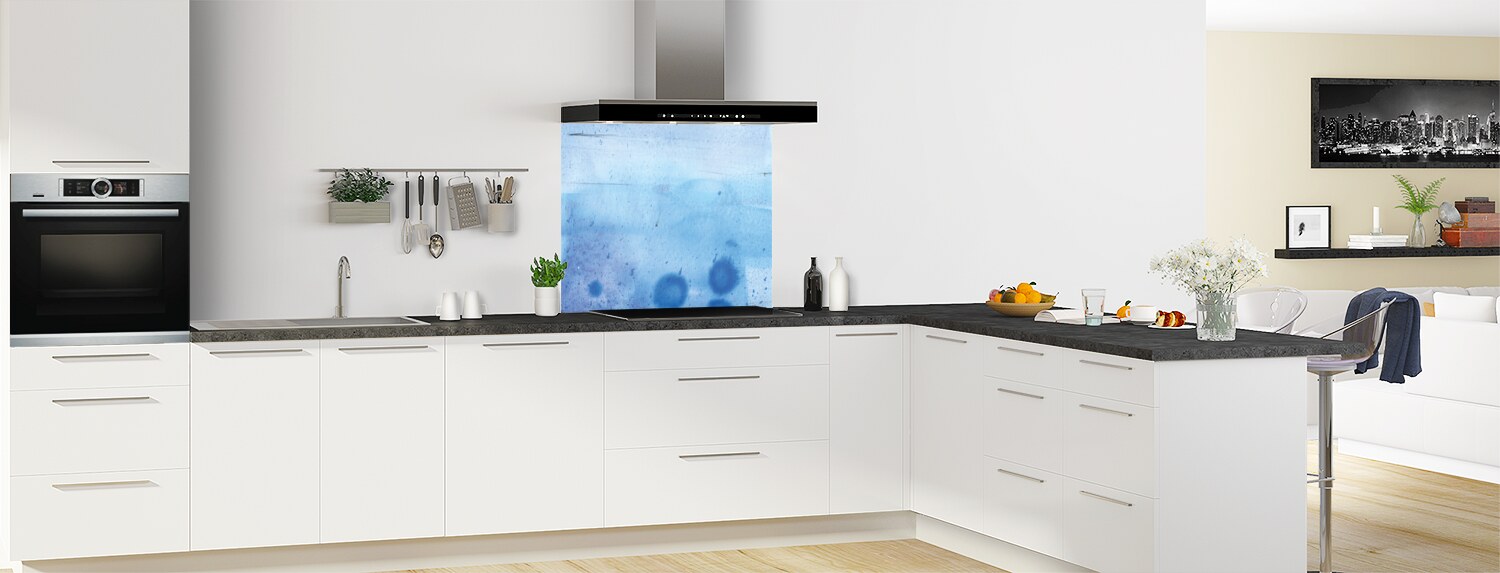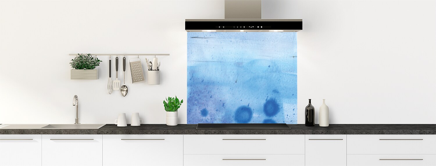 Quelques gouttes d'encre bleue pour ce fond de hotte qui saura parfaitement s'adapter à votre cuisine.