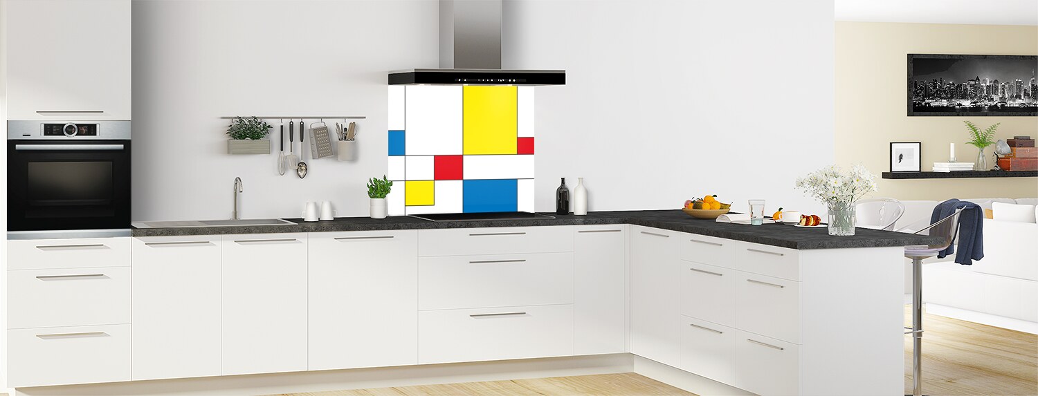 L'art abstrait s'invite chez vous... Ce fond de hotte original s'inspire de l'artiste Piet Mondrian et de son œuvre "Composition II en rouge, bleu et jaune" de 1930. Disponible en trois formats : fond de hotte, recouvrement et frise, ce décor se découpe et se colle facilement pour un fond de hotte sur mesure. Ajoutez une touche d'art à votre cuisine avec ce fond de hotte inspiré de l'un des plus grands artistes du XXe siècle.