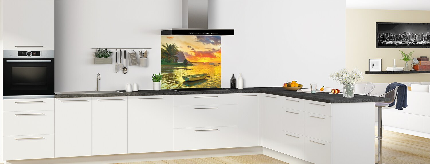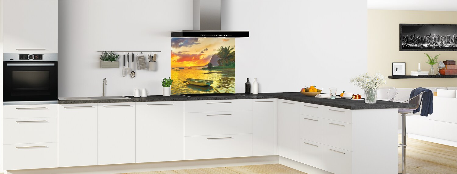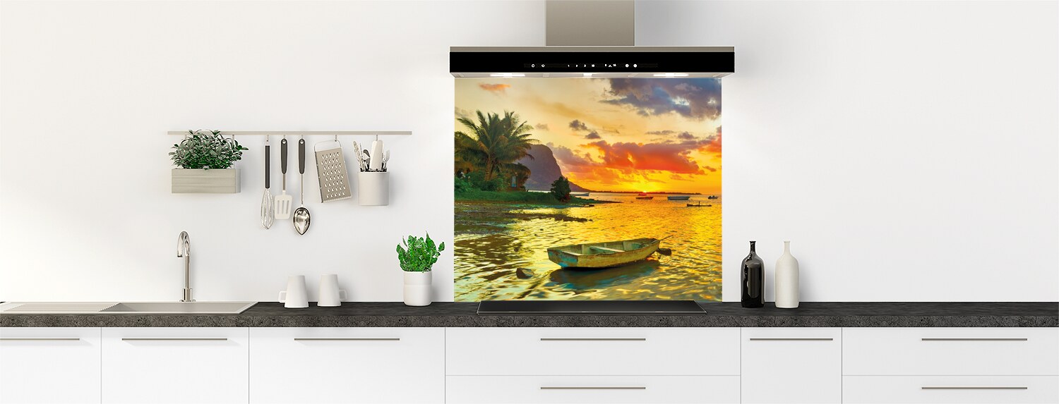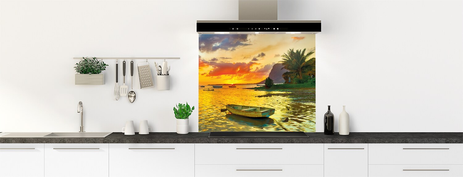 Ce magnifique paysage aux tons orangés et bleus donnera du relief à votre cuisine ! Le fond de hotte en polycarbonate ou en aluminium se découpe et se colle facilement pour une installation rapide et facile.