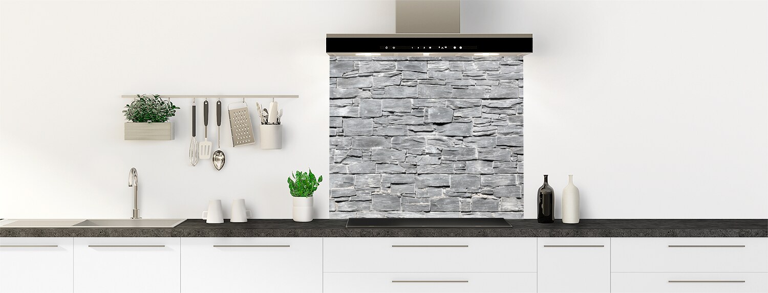 Un trompe l'oeil hyper réaliste pour ce parement de pierre ardoise grise qui sera du plus bel effet en fond de hotte ! Choisissez votre support et vos dimensions pour un fond de hotte totalement sur mesure qui vous permettra de recouvrir aisément un ancien carrelage ou faience de cuisine.