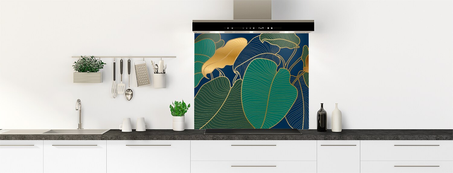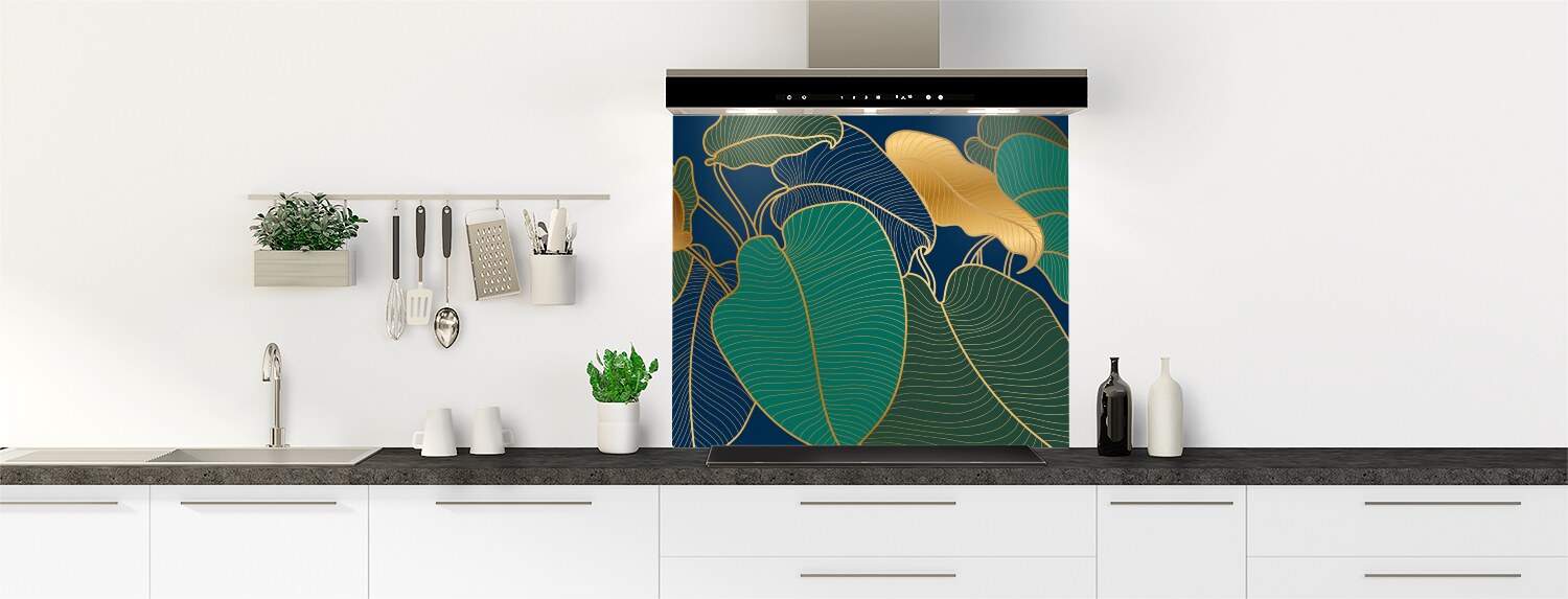 Donnez à votre cuisine une touche hyper déco avec ce motif élégant de feuilles dorées. Un décor riche et profond pour une cuisine sublime ! Choisissez le format et le support (polycarbonate ou aluminium) pour une crédence de cuisine vraiment sur mesure. Consultez la vidéo "Les modes de pose" pour vous faciliter l'installation de votre fond de hotte.