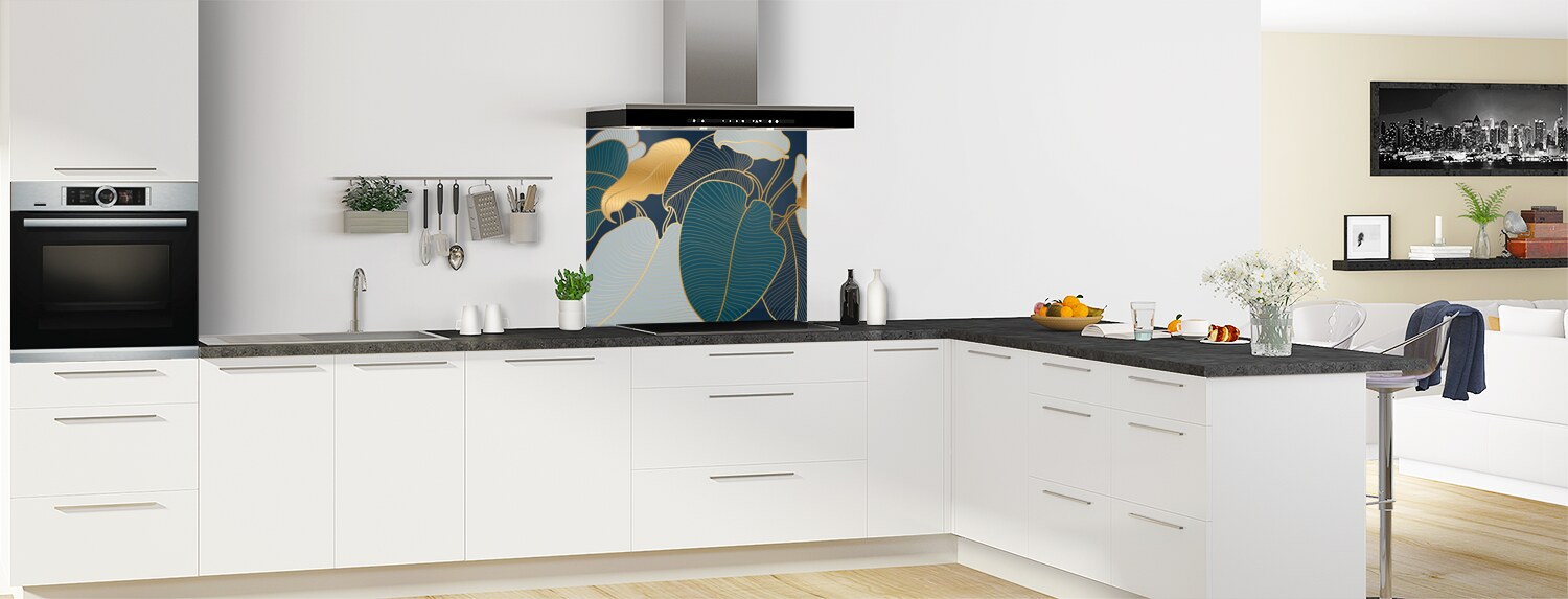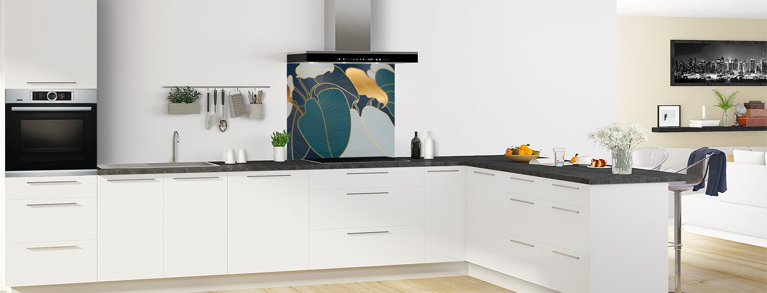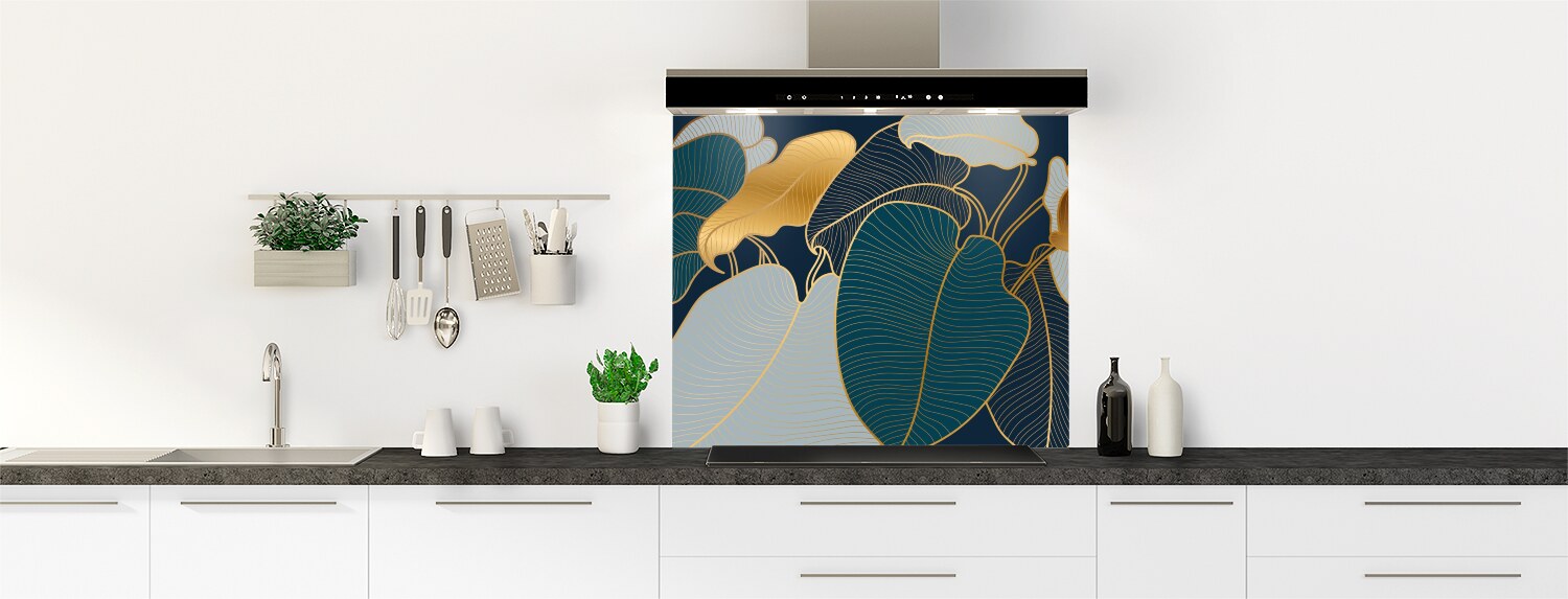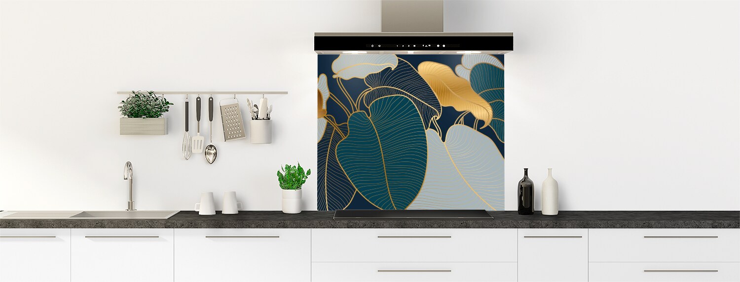 Relooker facilement votre cuisine avec une déco ultra tendance, c'est possible avec ce fond de hotte feuilles dorées sur fond bleu ! Nos supports totalement sur mesure se découpent et se collent facilement sur votre ancienne crédence ou directement sur un mur. Idéal pour rénover votre cuisine ou juste y ajouter un fond de hotte.