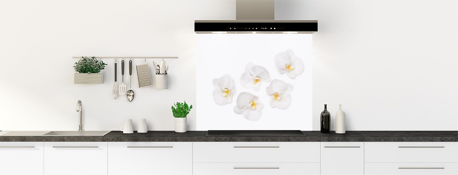 Ce fond de hotte aux fleurons d'orchidées si purs et esthétiques sera l'élément phare de votre cuisine !