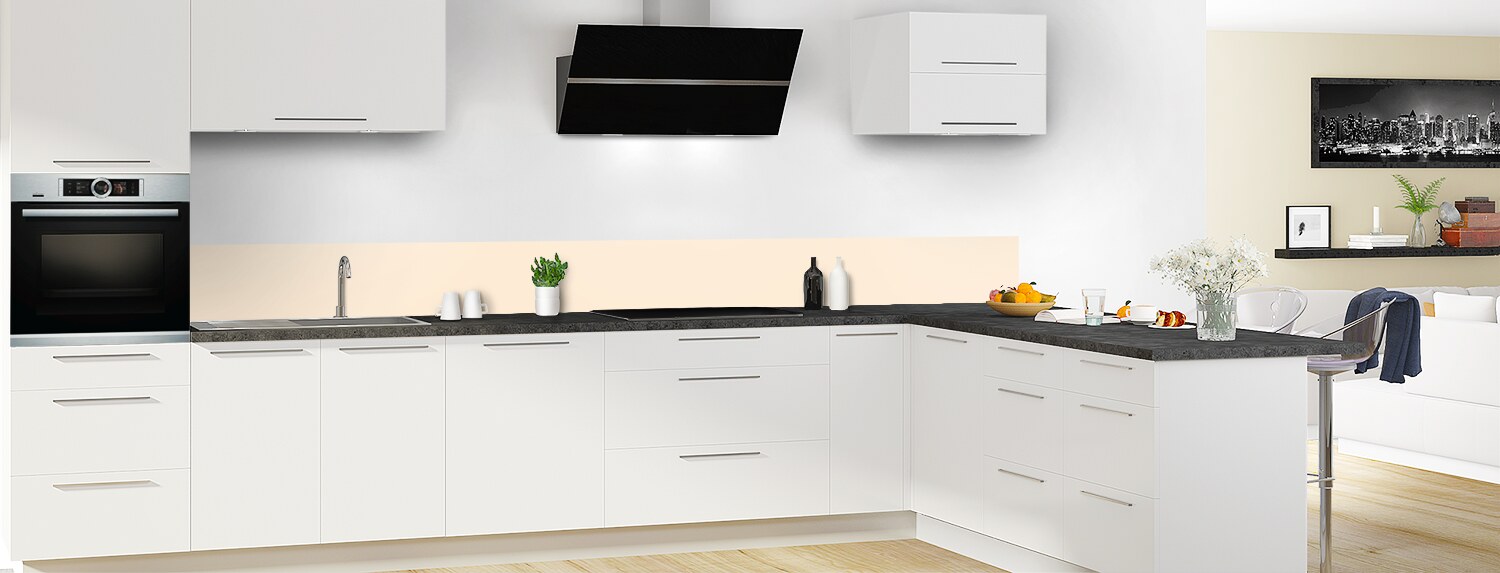Cette crédence ou fond de hotte couleur Dune, un beige rosé clair et doux, est disponible en aspect brillant sur polycarbonate ou en mat sur aluminium. Produit en total sur mesure et facile à coller sur tous supports.