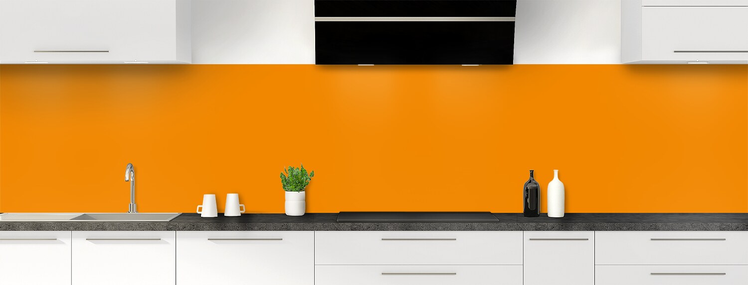 Crédence de cuisine et fond de hotte couleur Citrouille : une belle teinte orangée proche du pêche-abricot qui donne du charme à votre intérieur. Crédence brillante ou crédence mat au choix pour les 25 couleurs disponibles.