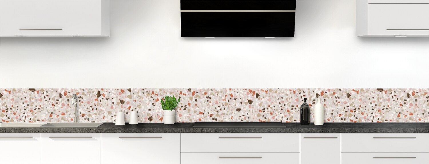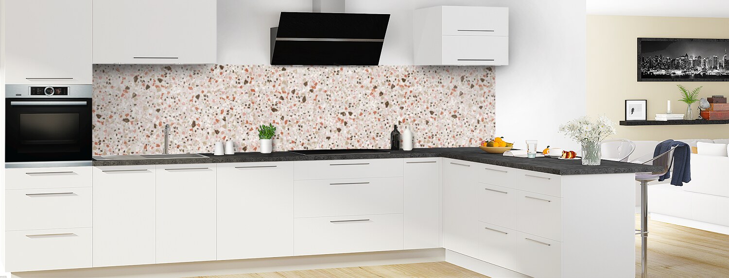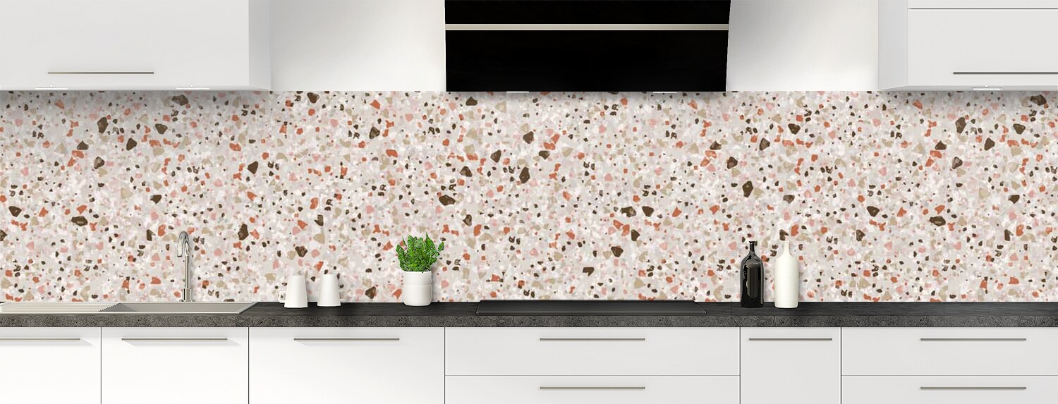 Le style Terrazzo est très en vogue ! Avec cette déclinaison "Terrazzo terracotta" vous surfez sur la double tendance du moment à la fois avec le motif et la couleur. Le top de la tendance pour une crédence ou un fond de hotte disponible en finition mate ou brillante.