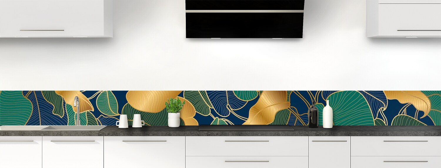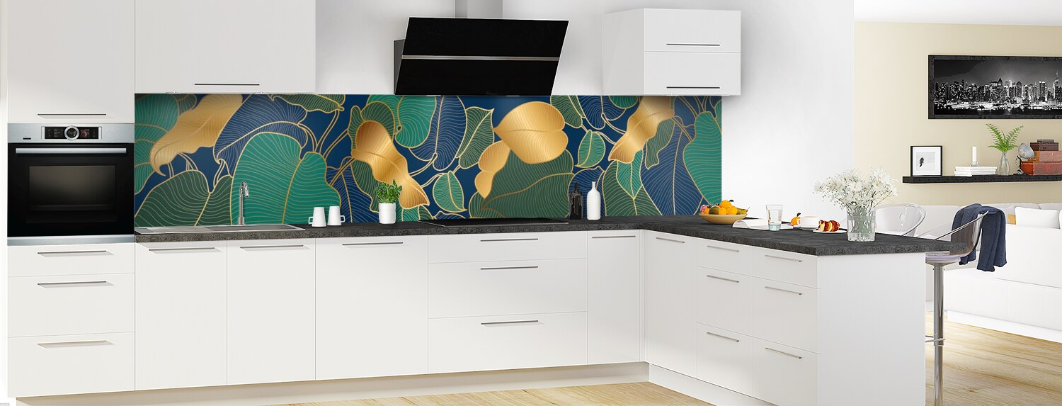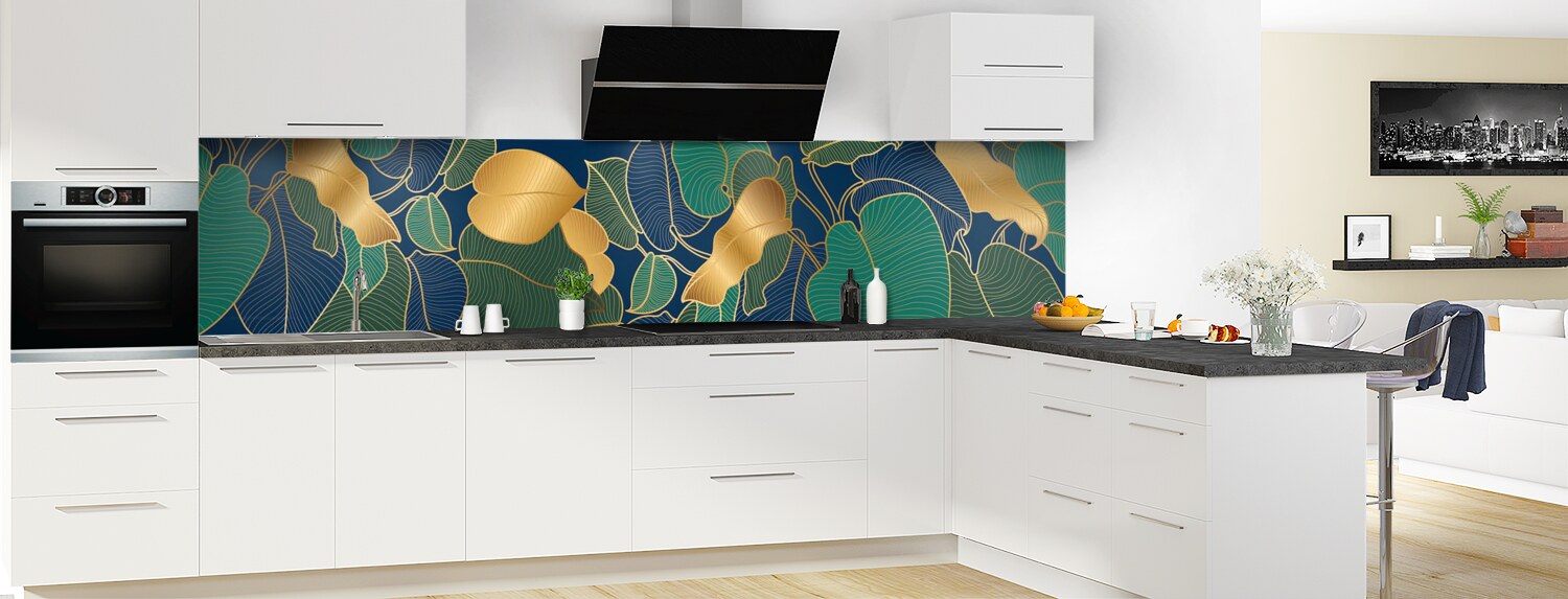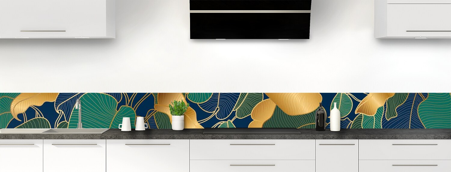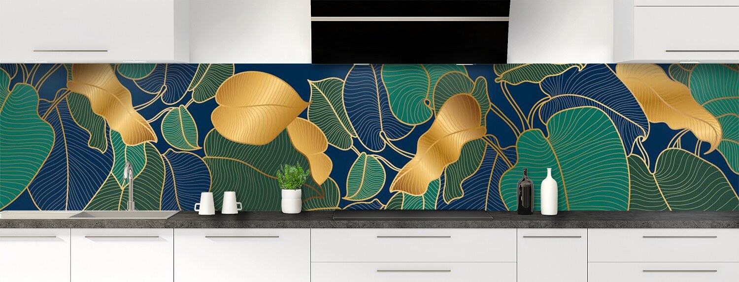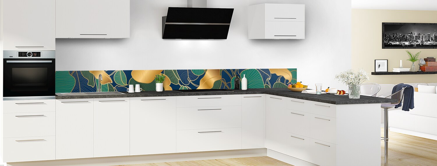 Donnez à votre cuisine une touche hyper déco avec ce motif élégant de feuilles dorées. Un décor riche et profond pour une cuisine sublime ! Choisissez le format et le support (polycarbonate ou aluminium) pour une crédence de cuisine vraiment sur mesure. Consultez la vidéo "Les modes de pose" pour vous faciliter l'installation de votre panneau.