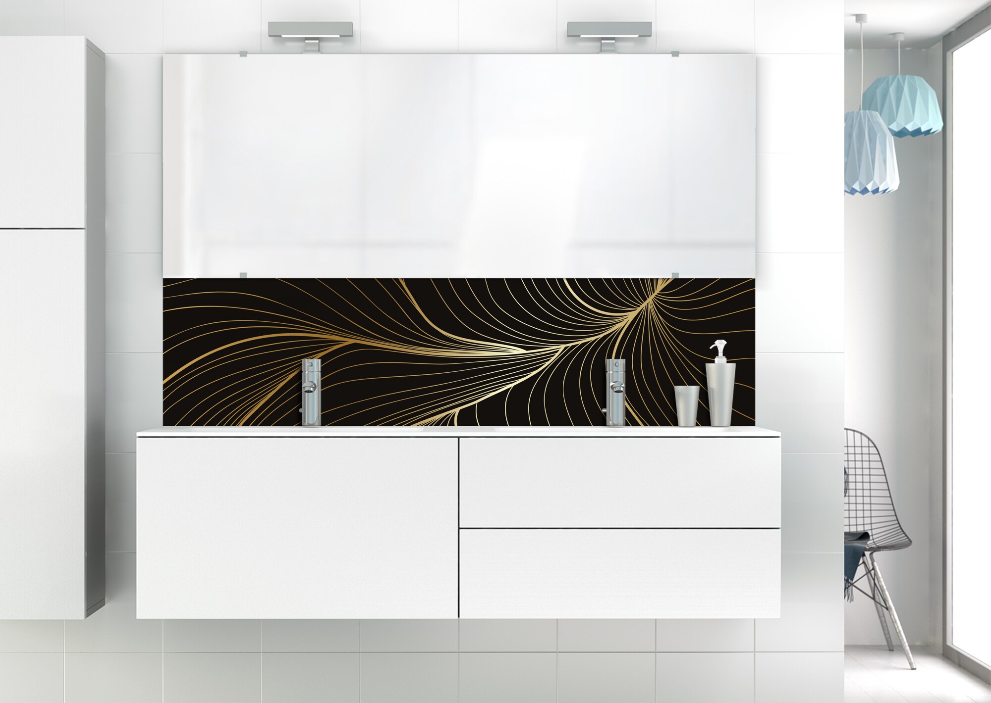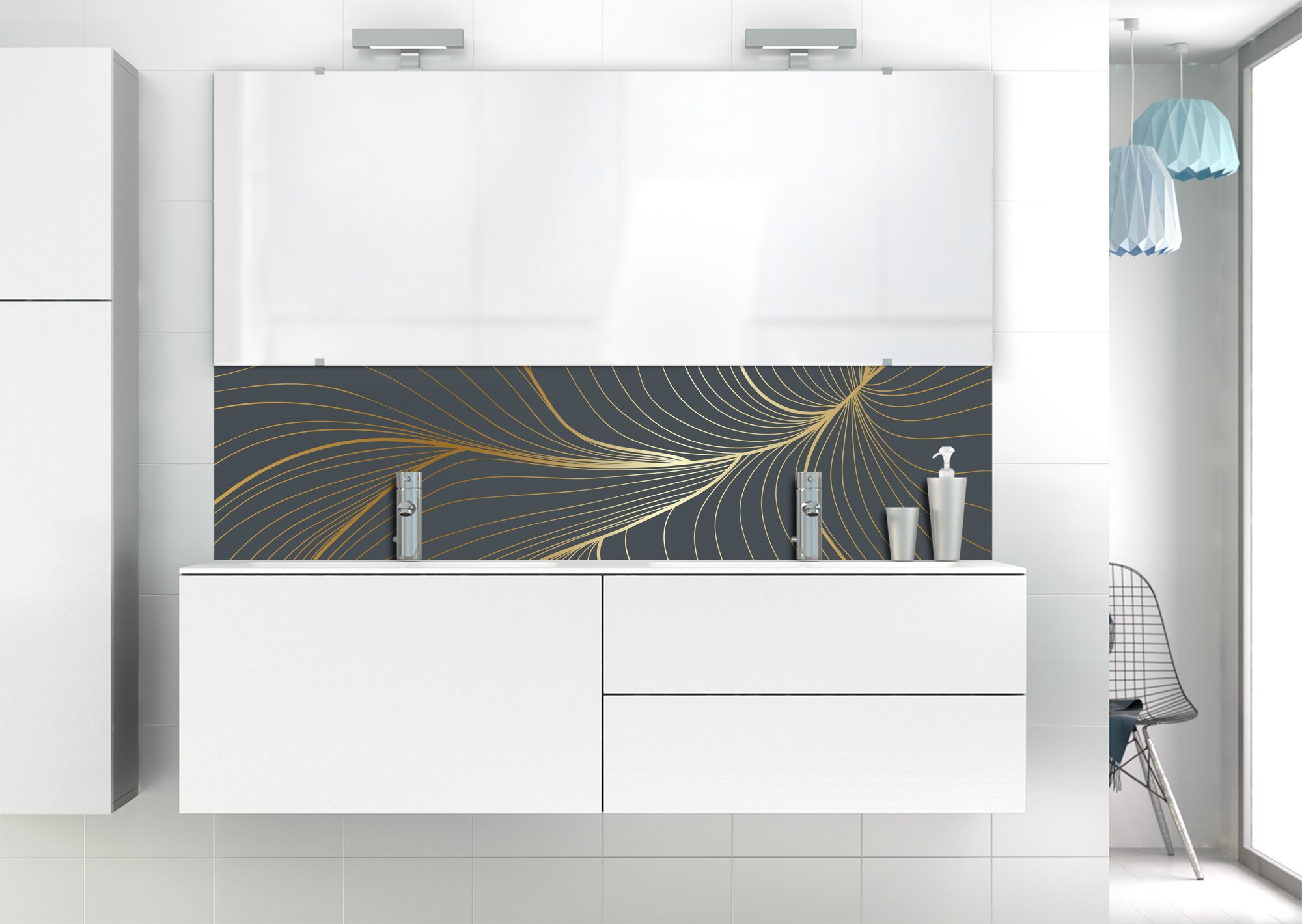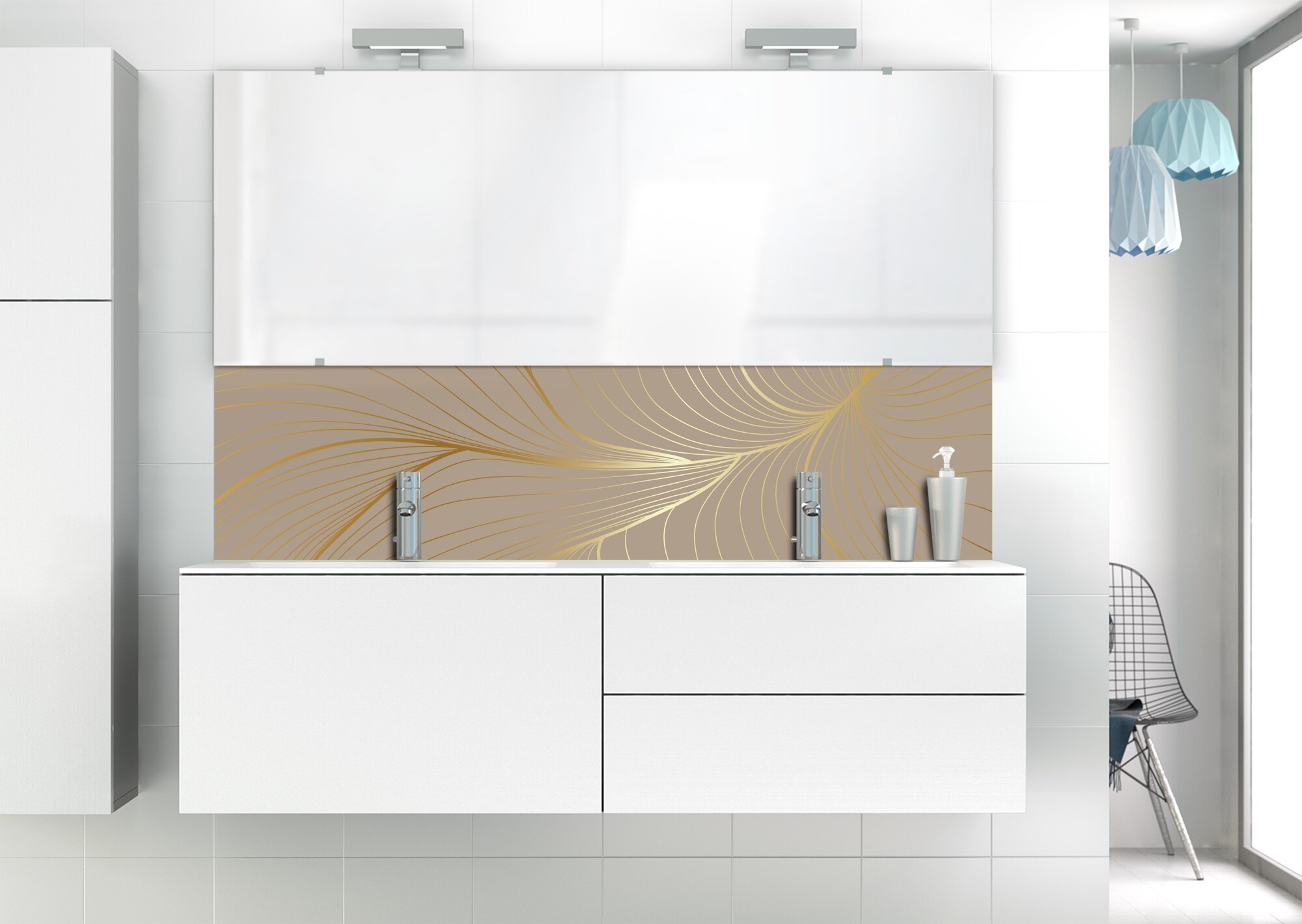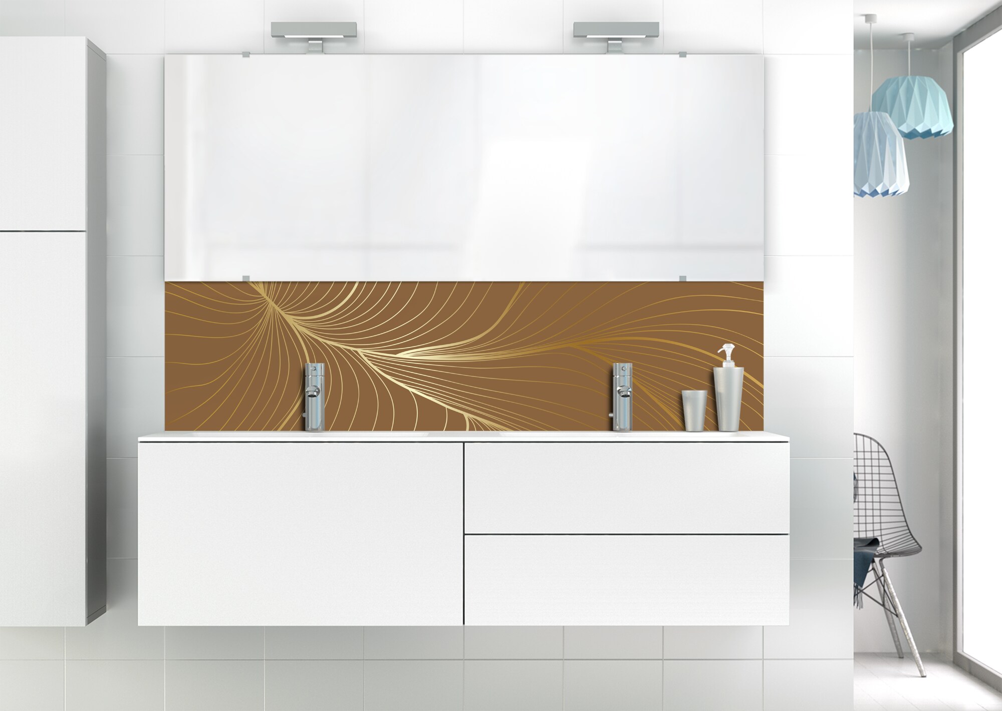 L'élégance du doré dans votre salle de bain avec un panneau de vasque aux lignes courbes et sensuelles de ce décor Volupté. Disponible en 25 couleurs tendances, choisissez celle qui révèlera votre personnalité dans la déco de votre salle de bain.