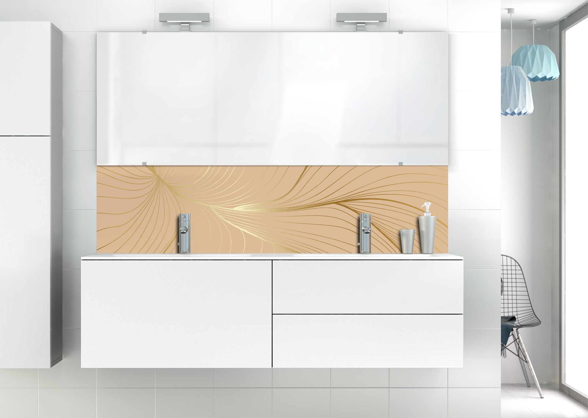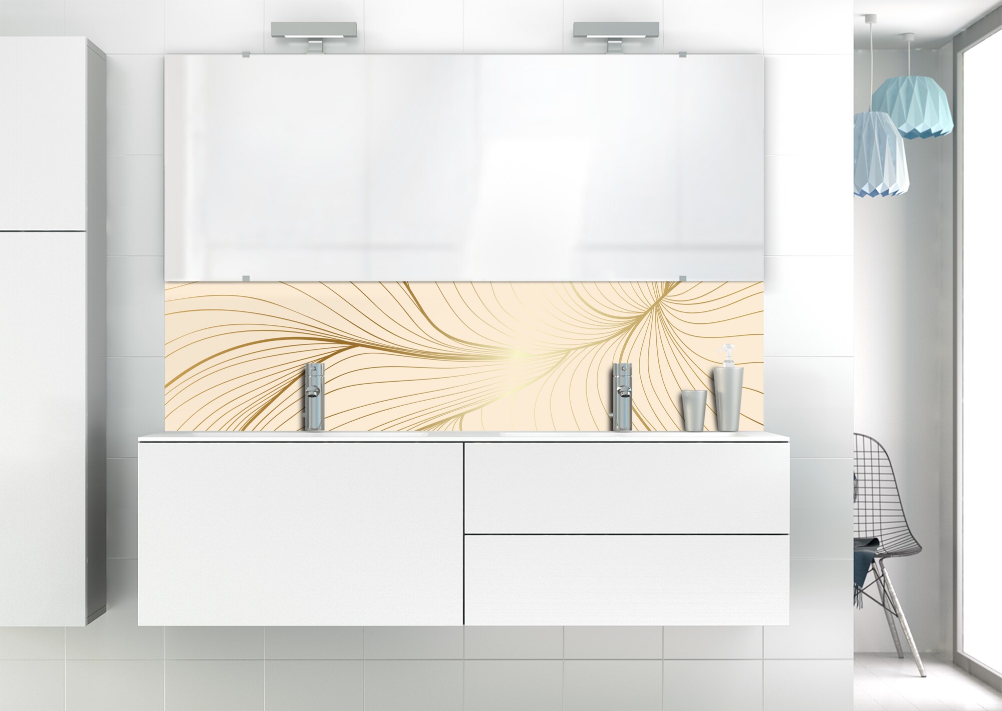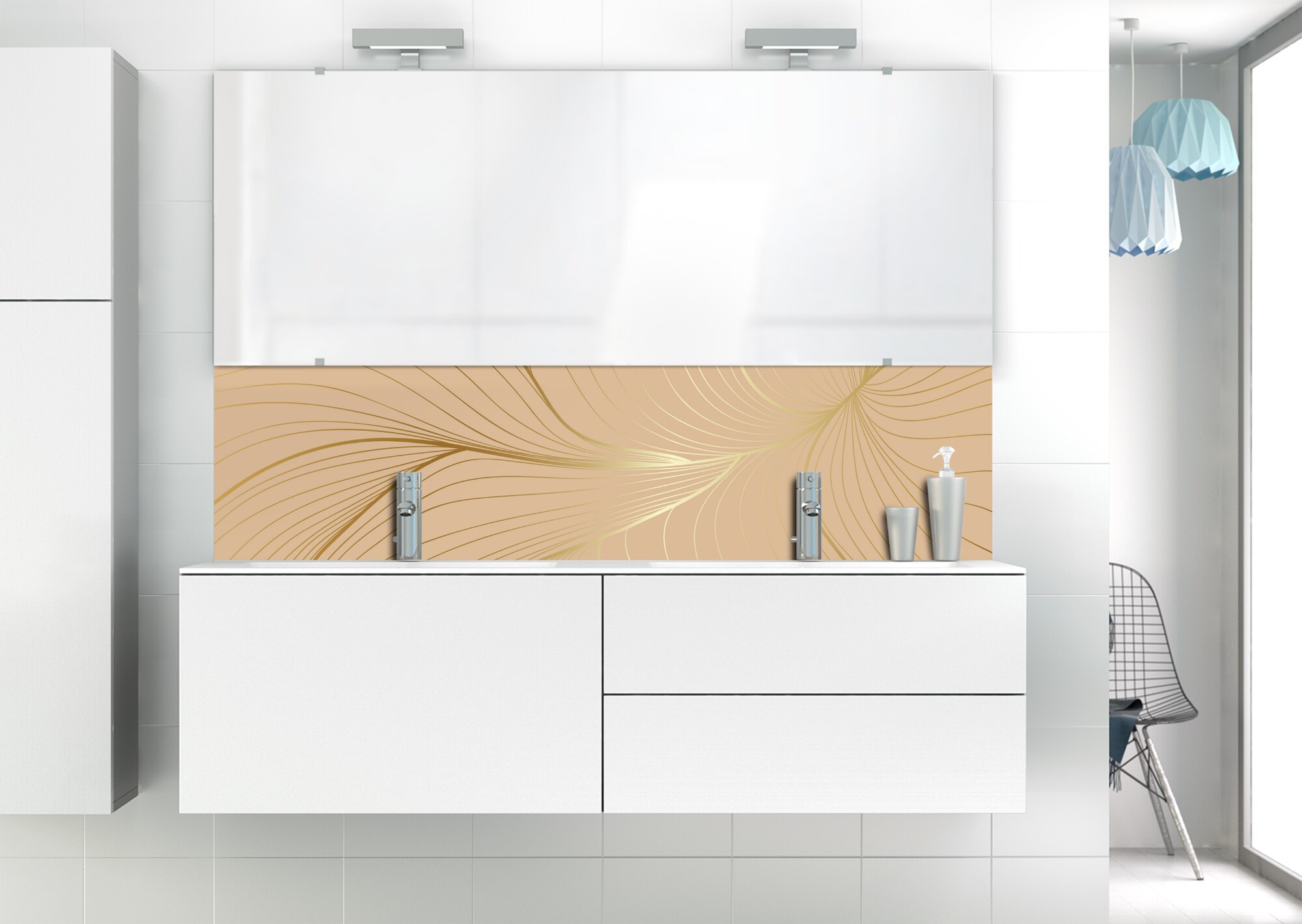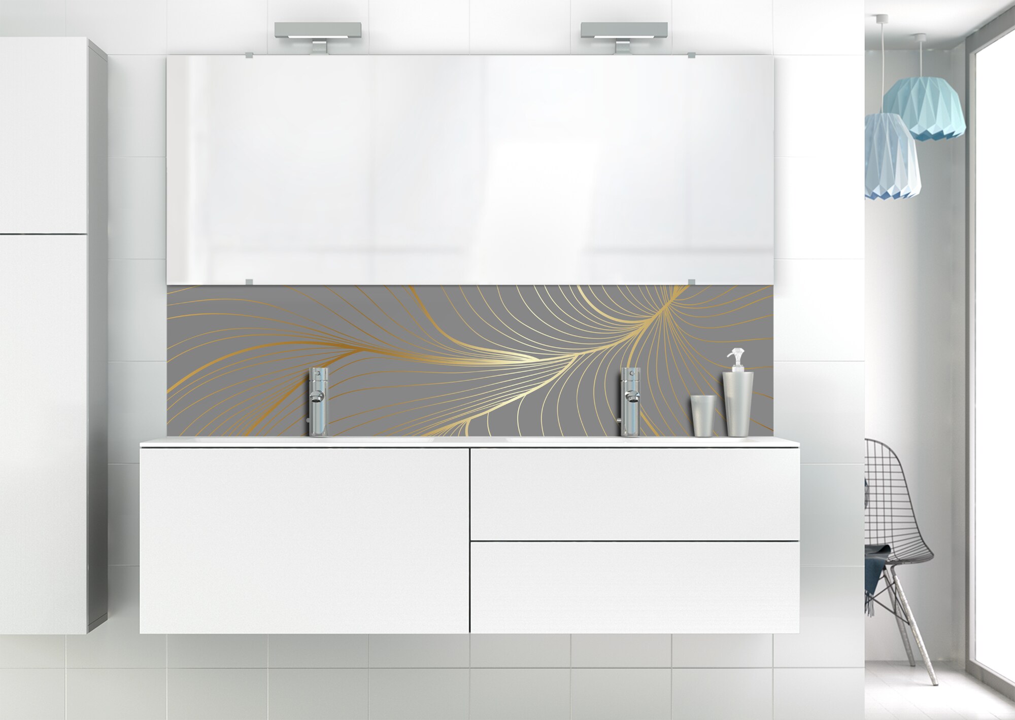 L'élégance du doré dans votre salle de bain avec un panneau de vasque aux lignes courbes et sensuelles de ce décor Volupté. Disponible en 25 couleurs tendances, choisissez celle qui révèlera votre personnalité dans la déco de votre salle de bain.