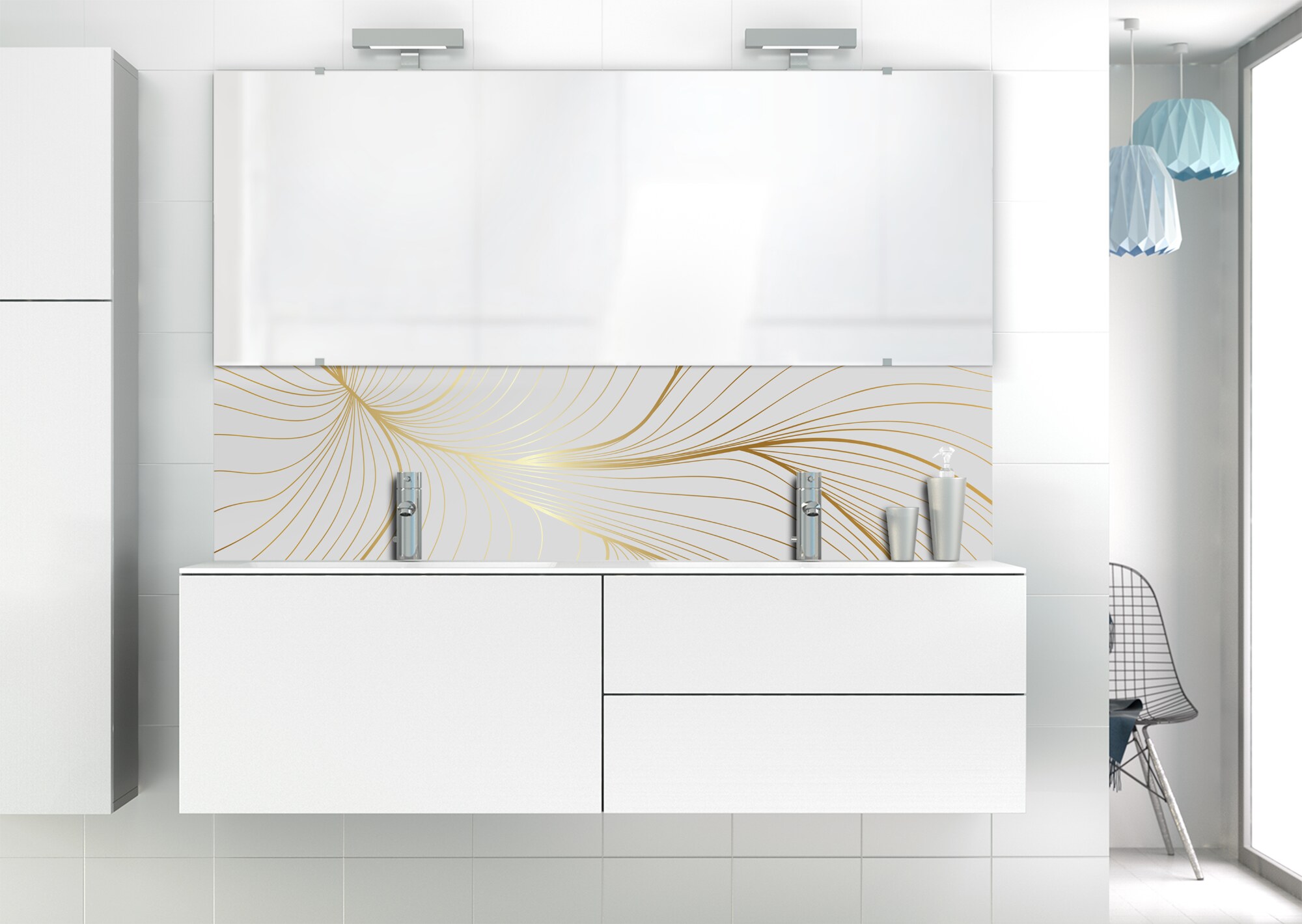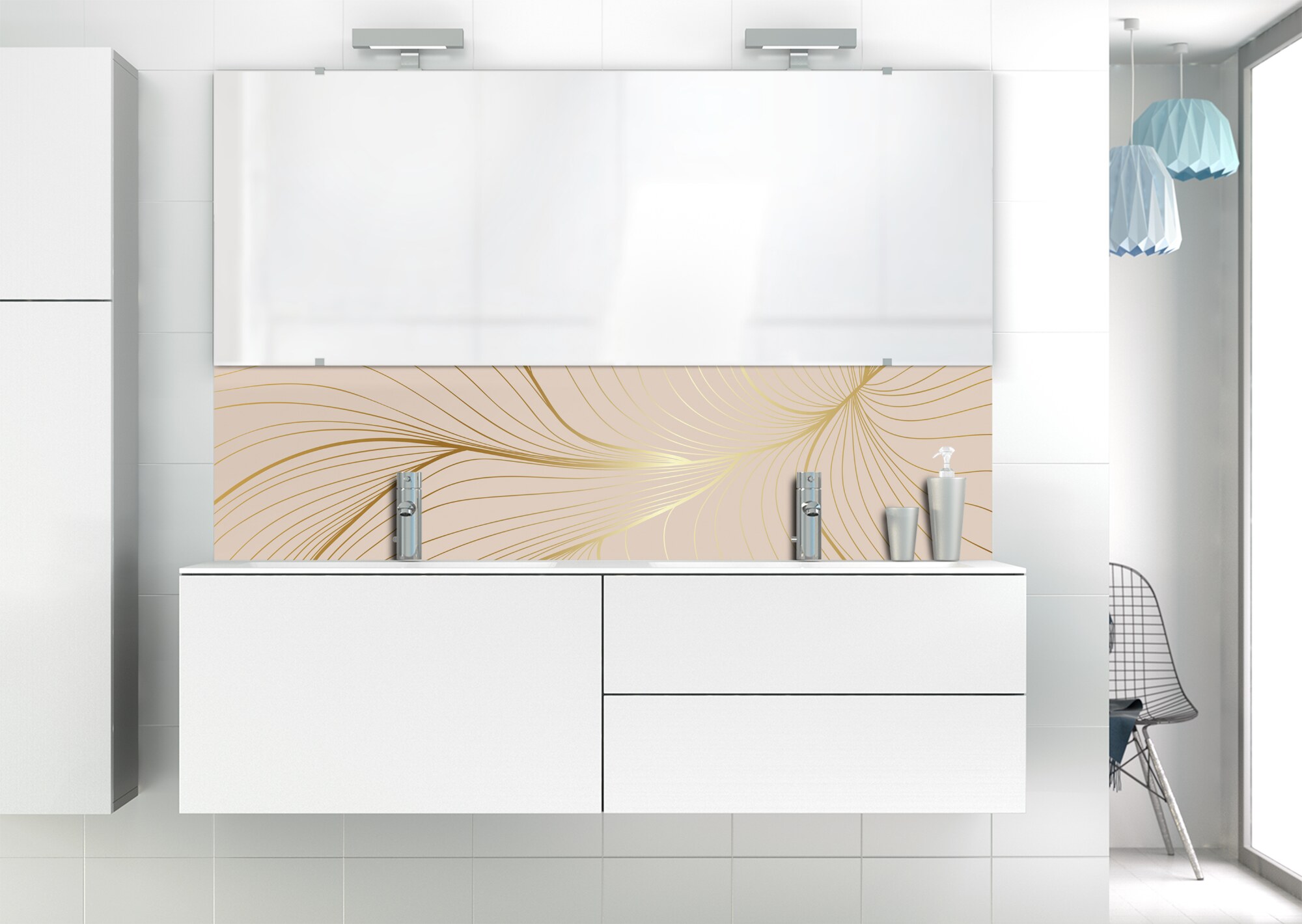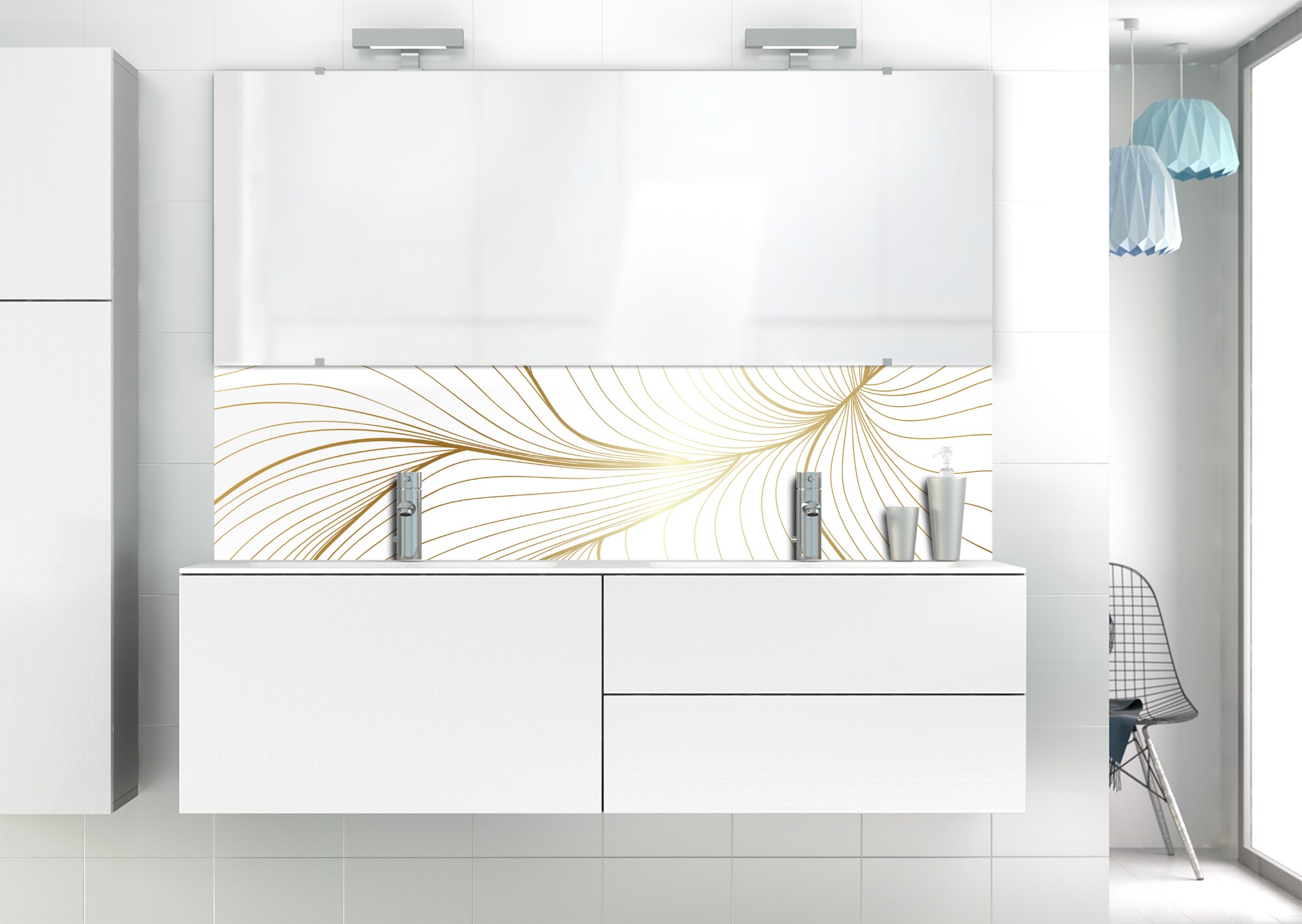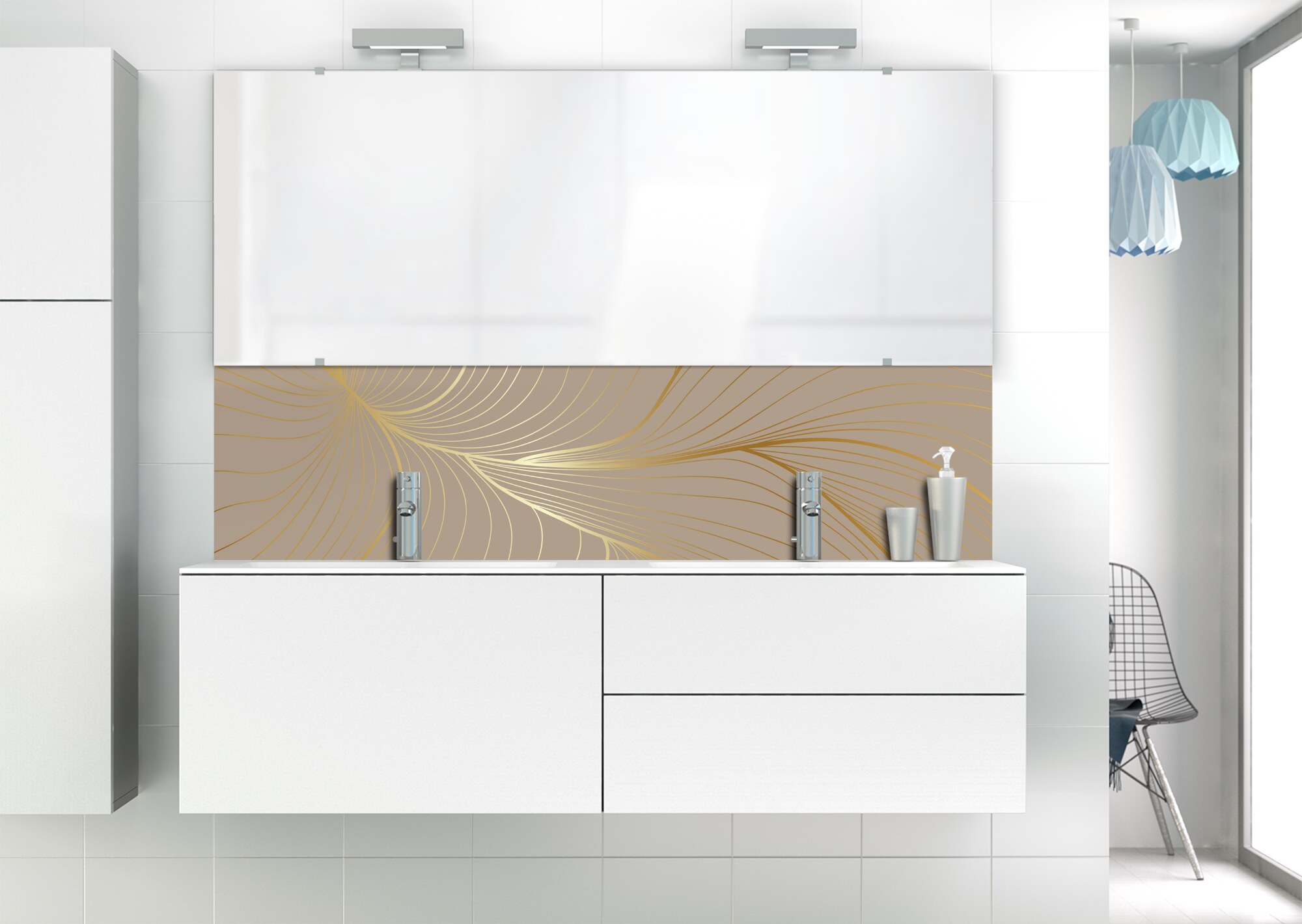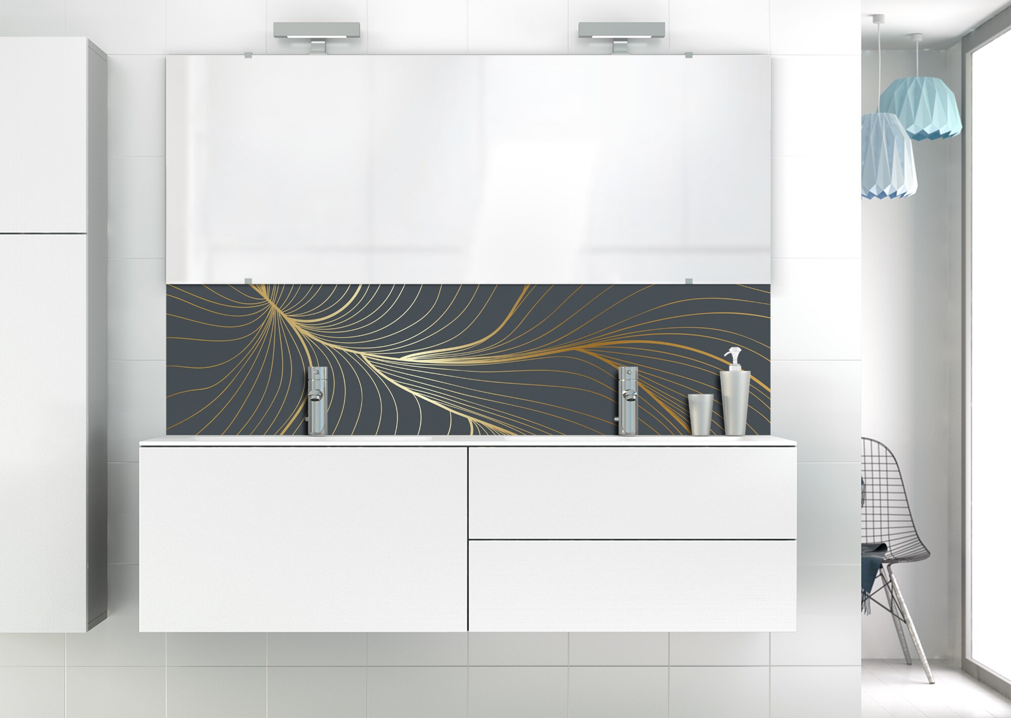 L'élégance du doré dans votre salle de bain avec un panneau de vasque aux lignes courbes et sensuelles de ce décor Volupté. Disponible en 25 couleurs tendances, choisissez celle qui révèlera votre personnalité dans la déco de votre salle de bain.