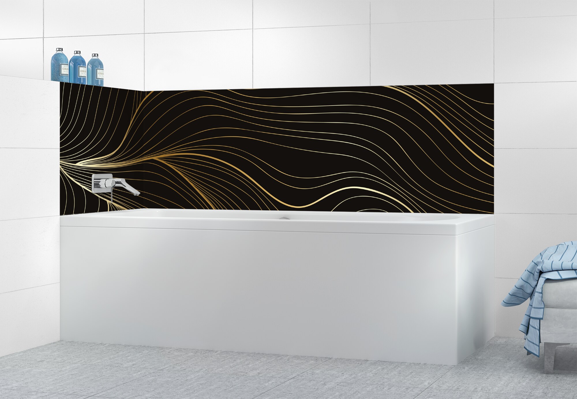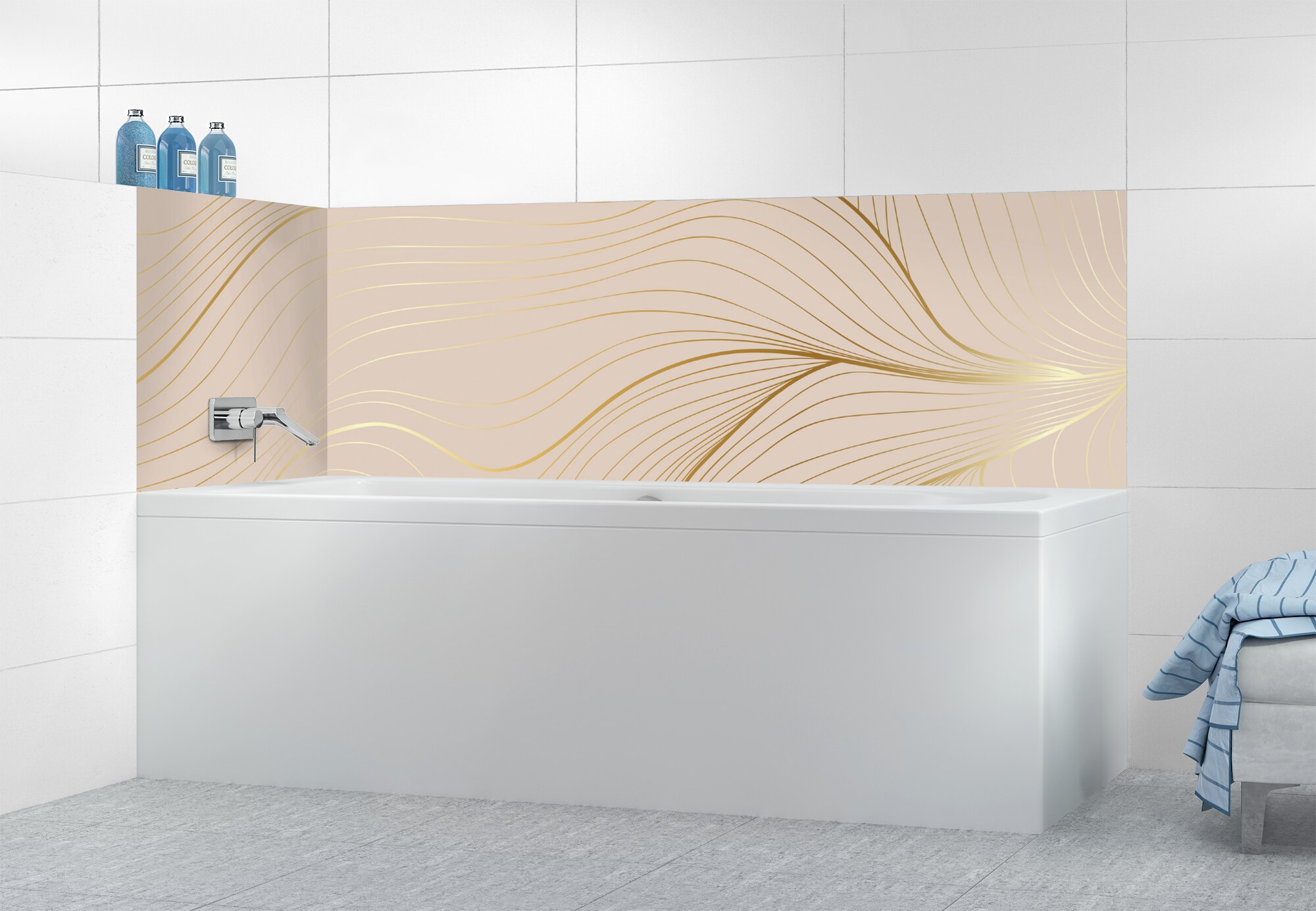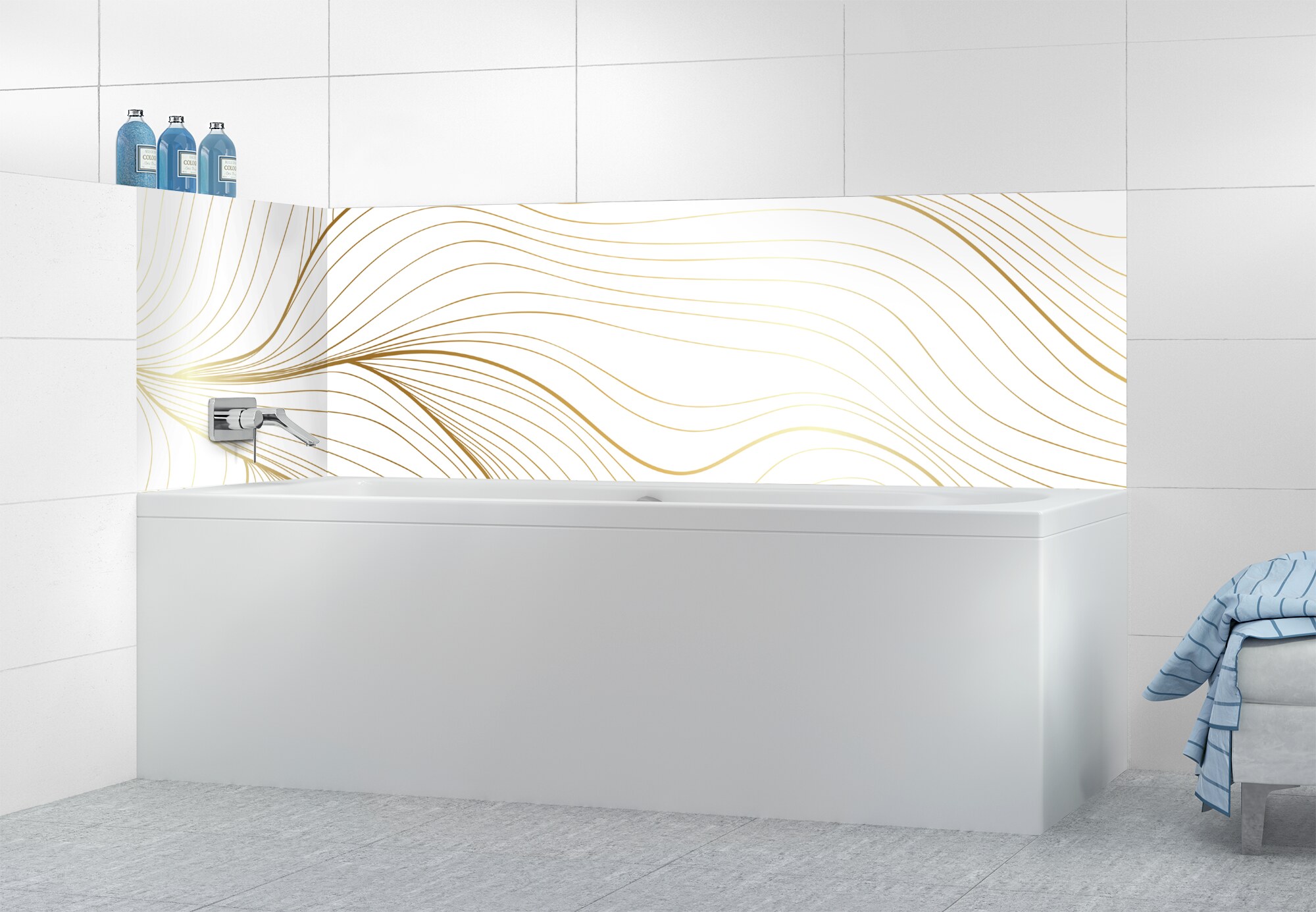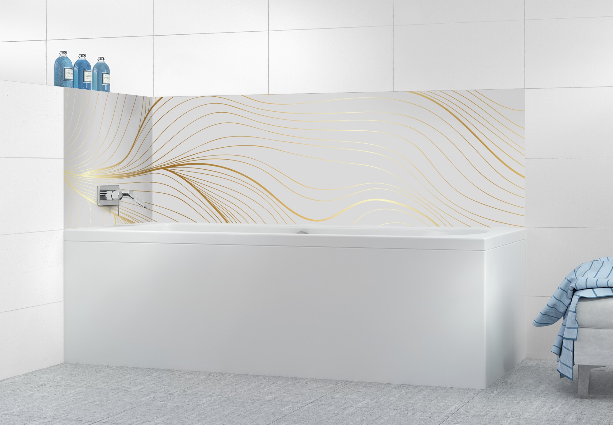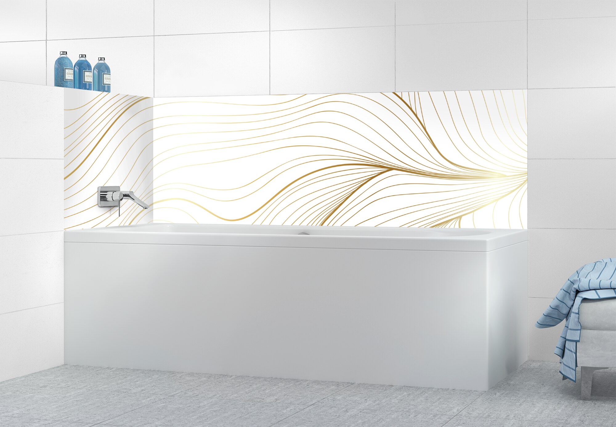 L'élégance du doré dans votre salle de bain avec un panneau de baignoire aux lignes courbes et sensuelles de ce décor Volupté. Disponible en 25 couleurs tendances, choisissez celle qui révèlera votre personnalité dans la déco de votre salle de bain.