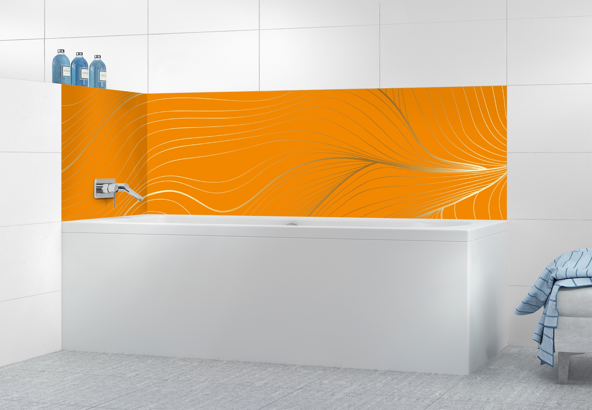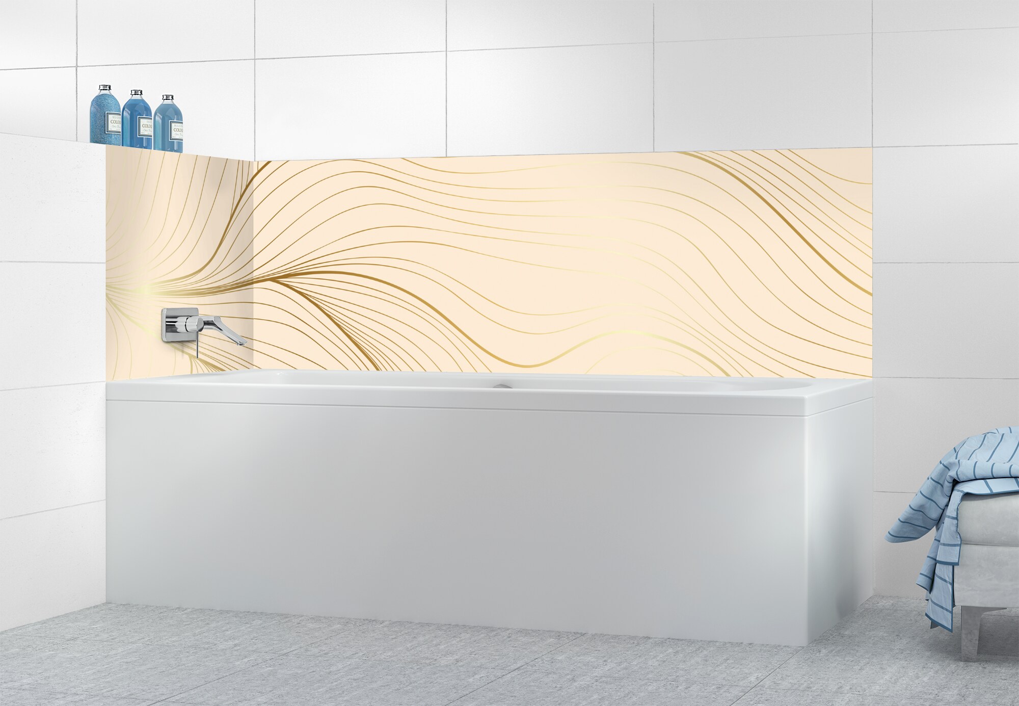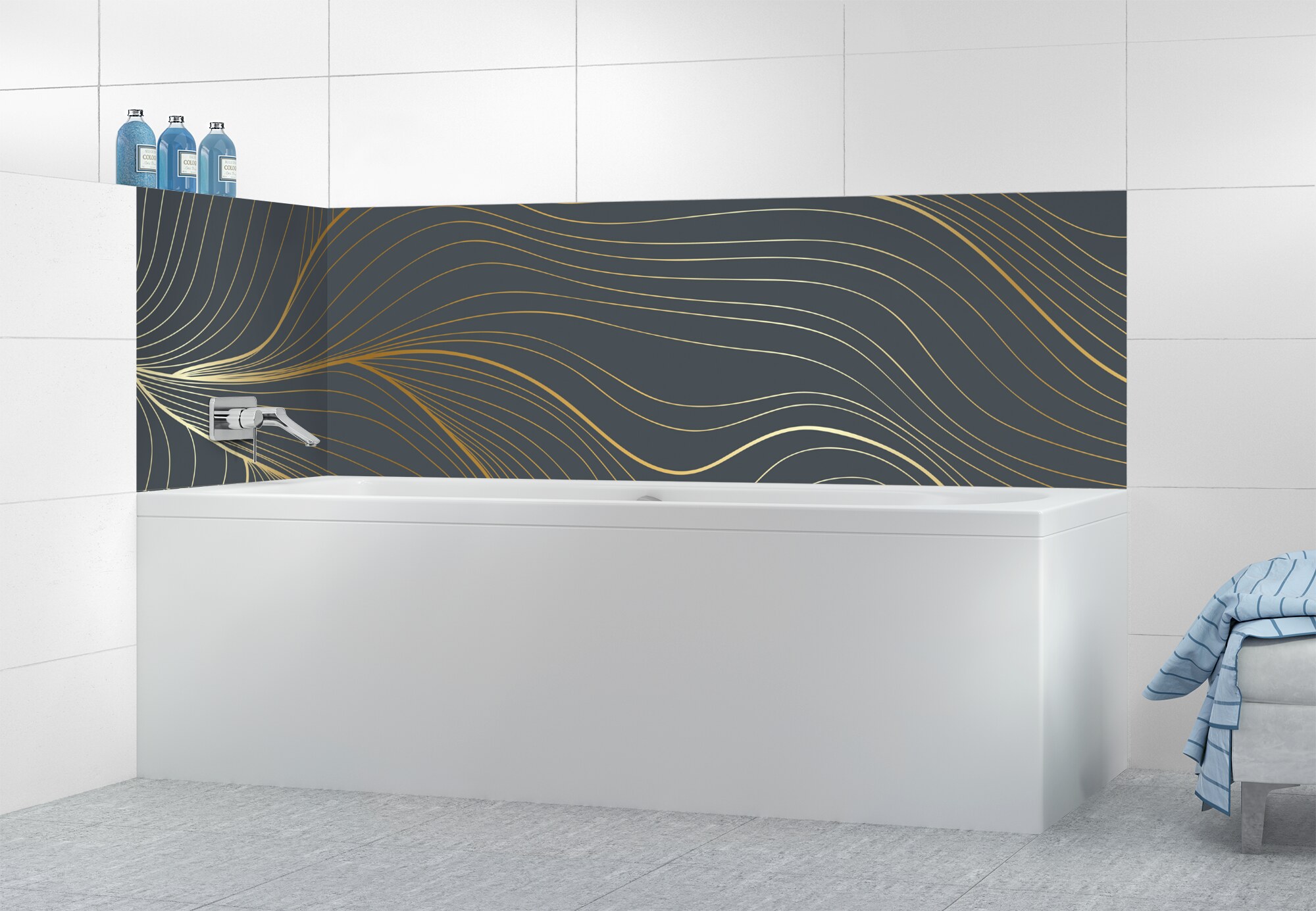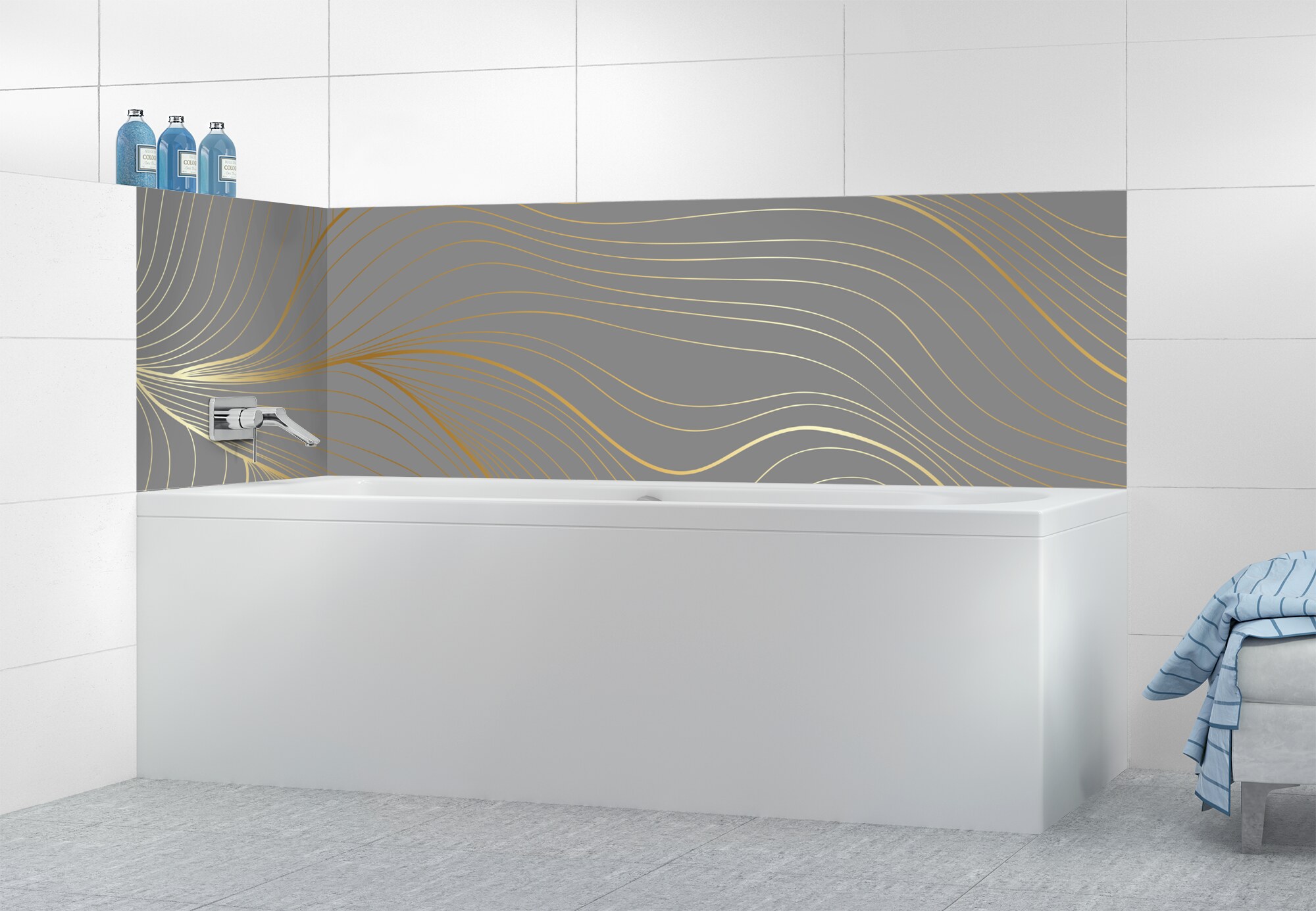 L'élégance du doré dans votre salle de bain avec un panneau de baignoire aux lignes courbes et sensuelles de ce décor Volupté. Disponible en 25 couleurs tendances, choisissez celle qui révèlera votre personnalité dans la déco de votre salle de bain.