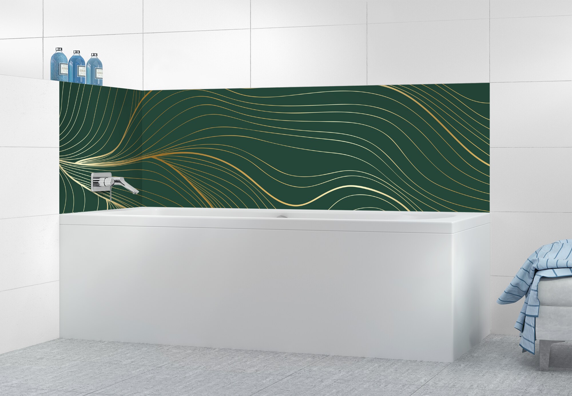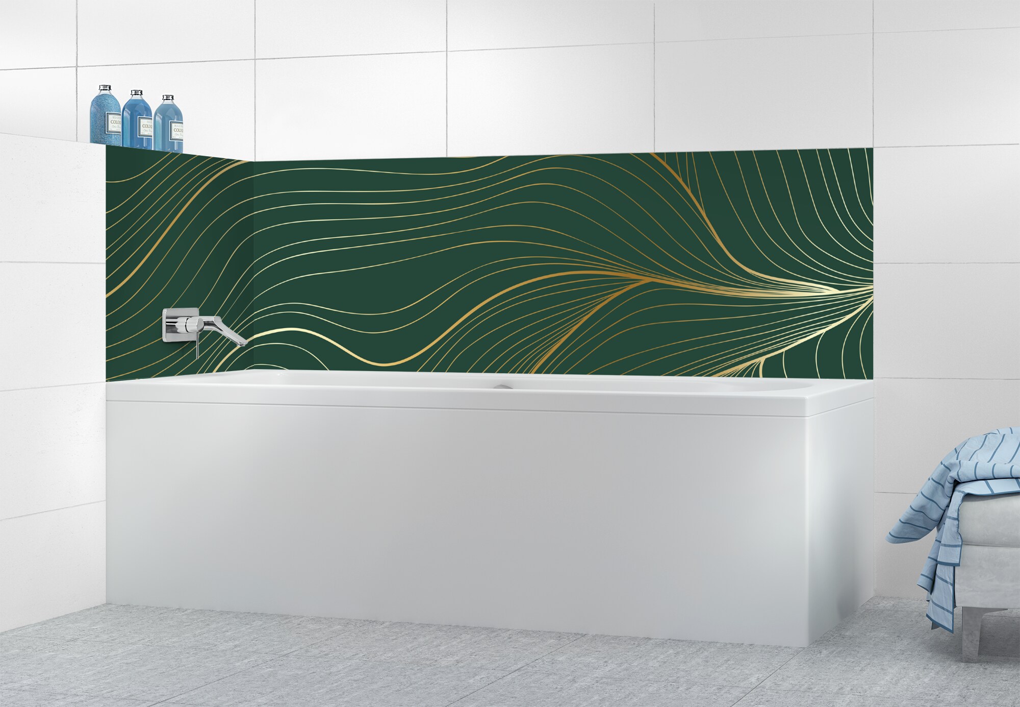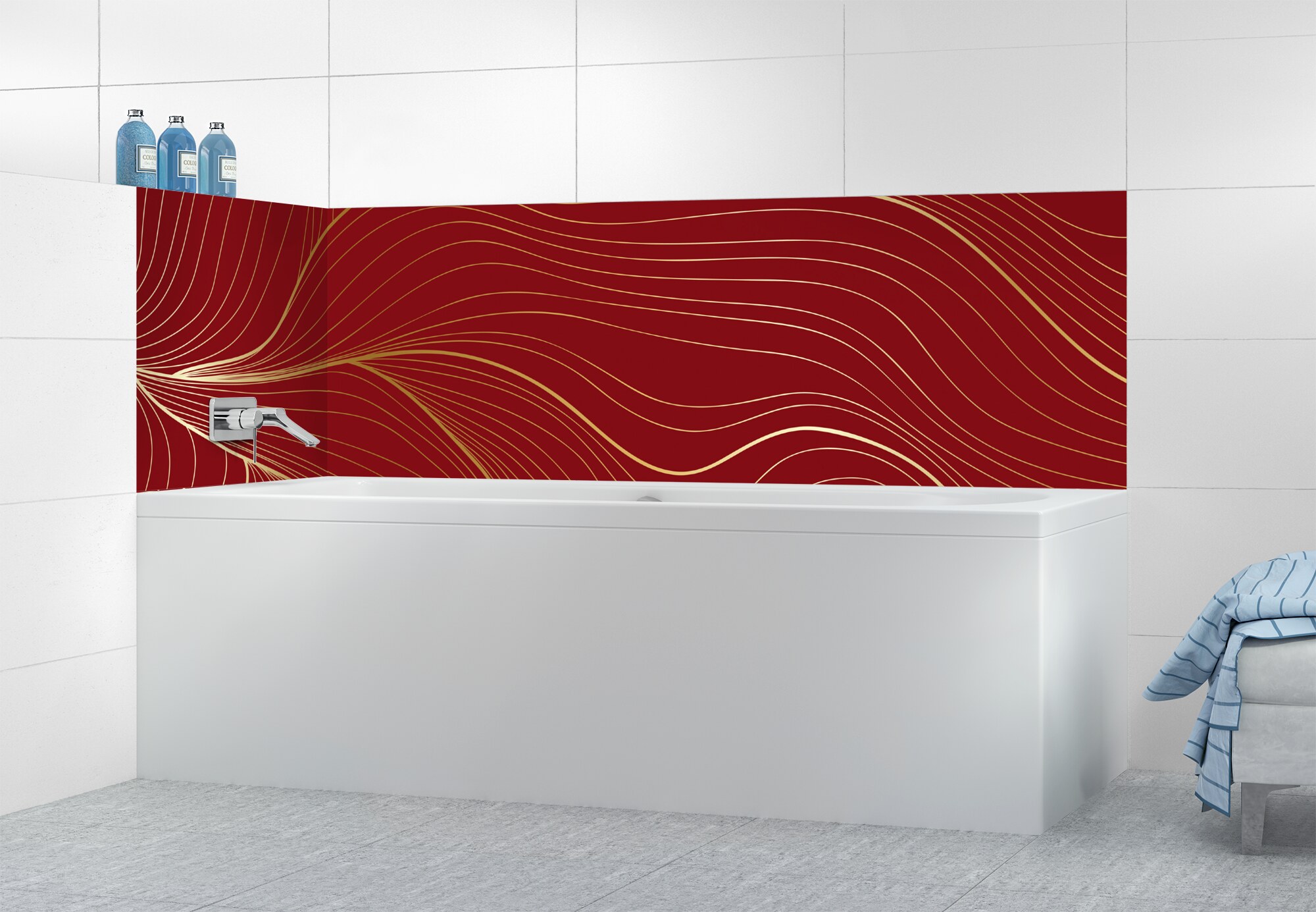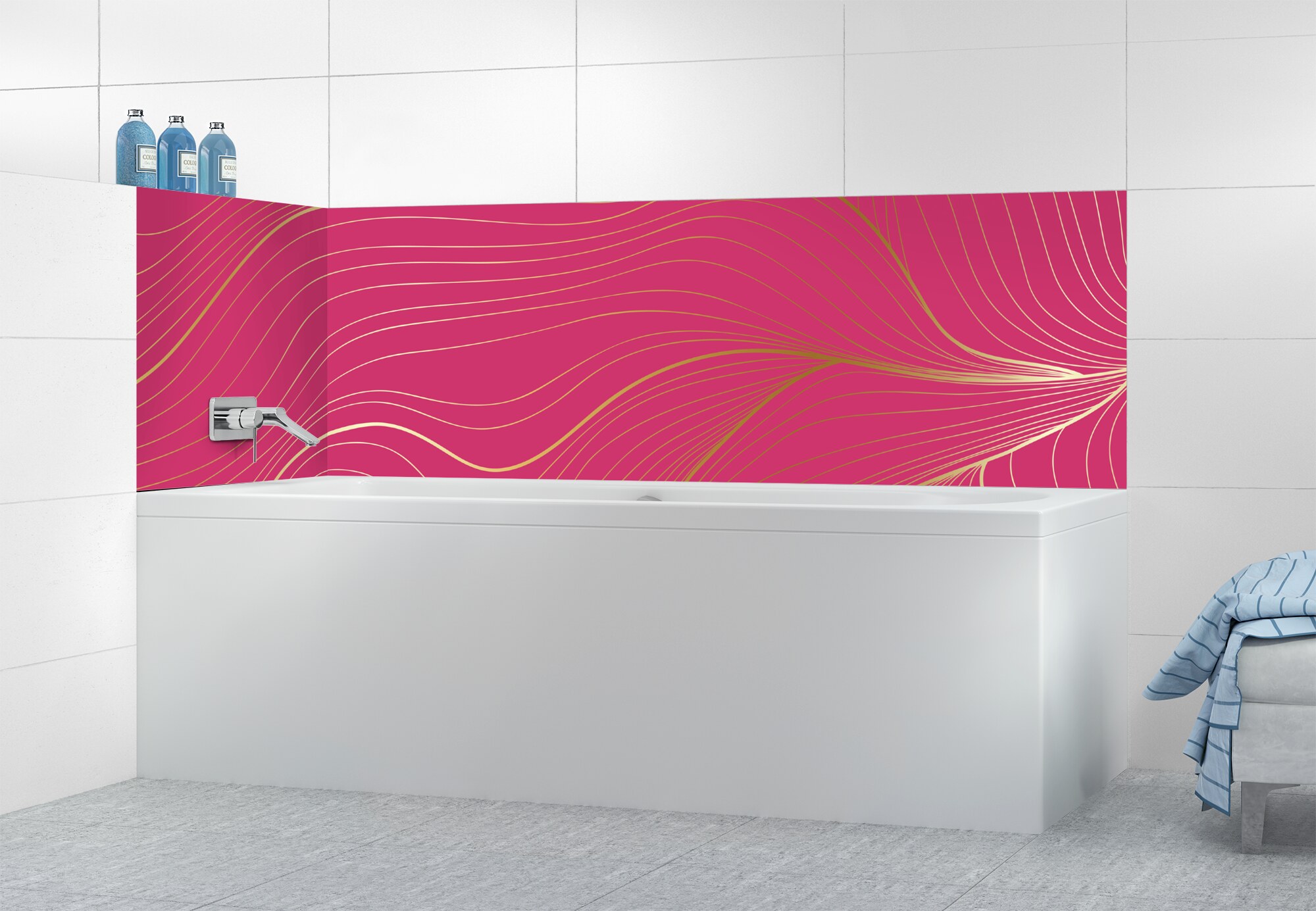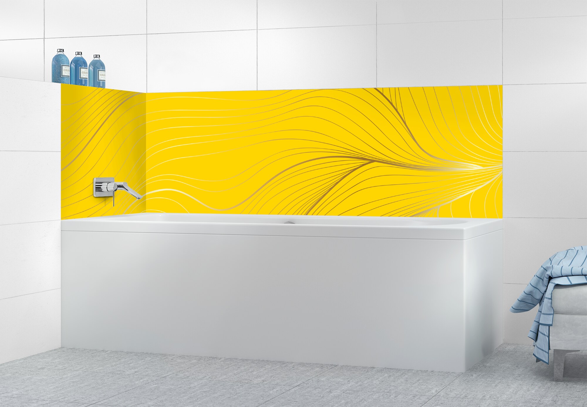 L'élégance du doré dans votre salle de bain avec un panneau de baignoire aux lignes courbes et sensuelles de ce décor Volupté. Disponible en 25 couleurs tendances, choisissez celle qui révèlera votre personnalité dans la déco de votre salle de bain.