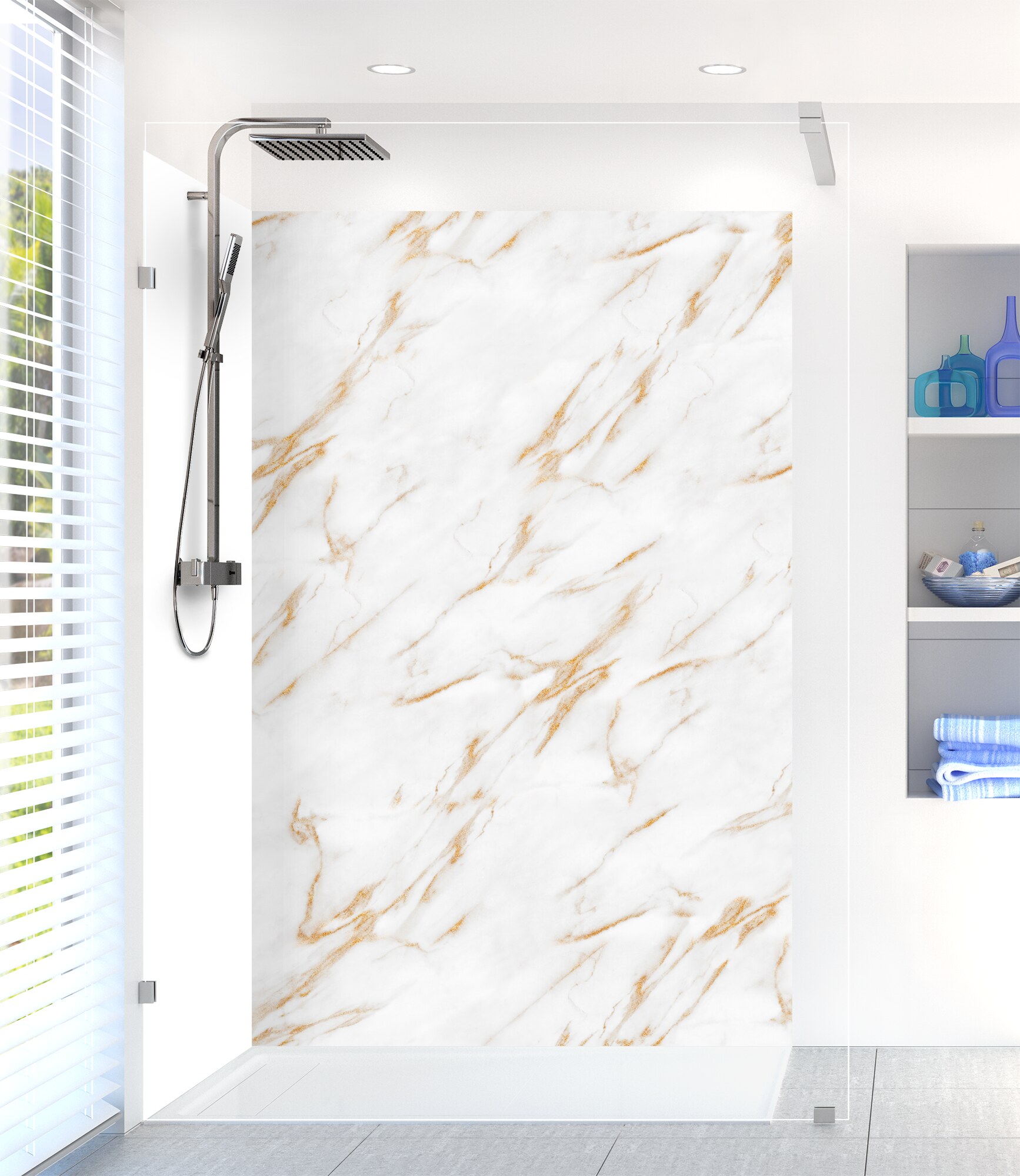 La finesse de ce marbre blanc aux nervures grises teintées de doré apporte dans votre douche une ambiance luxueuse, douce et cosy. Choisissez votre support aluminium ou polycrbonate pour un rendu mat ou brillant selon vos préférences.