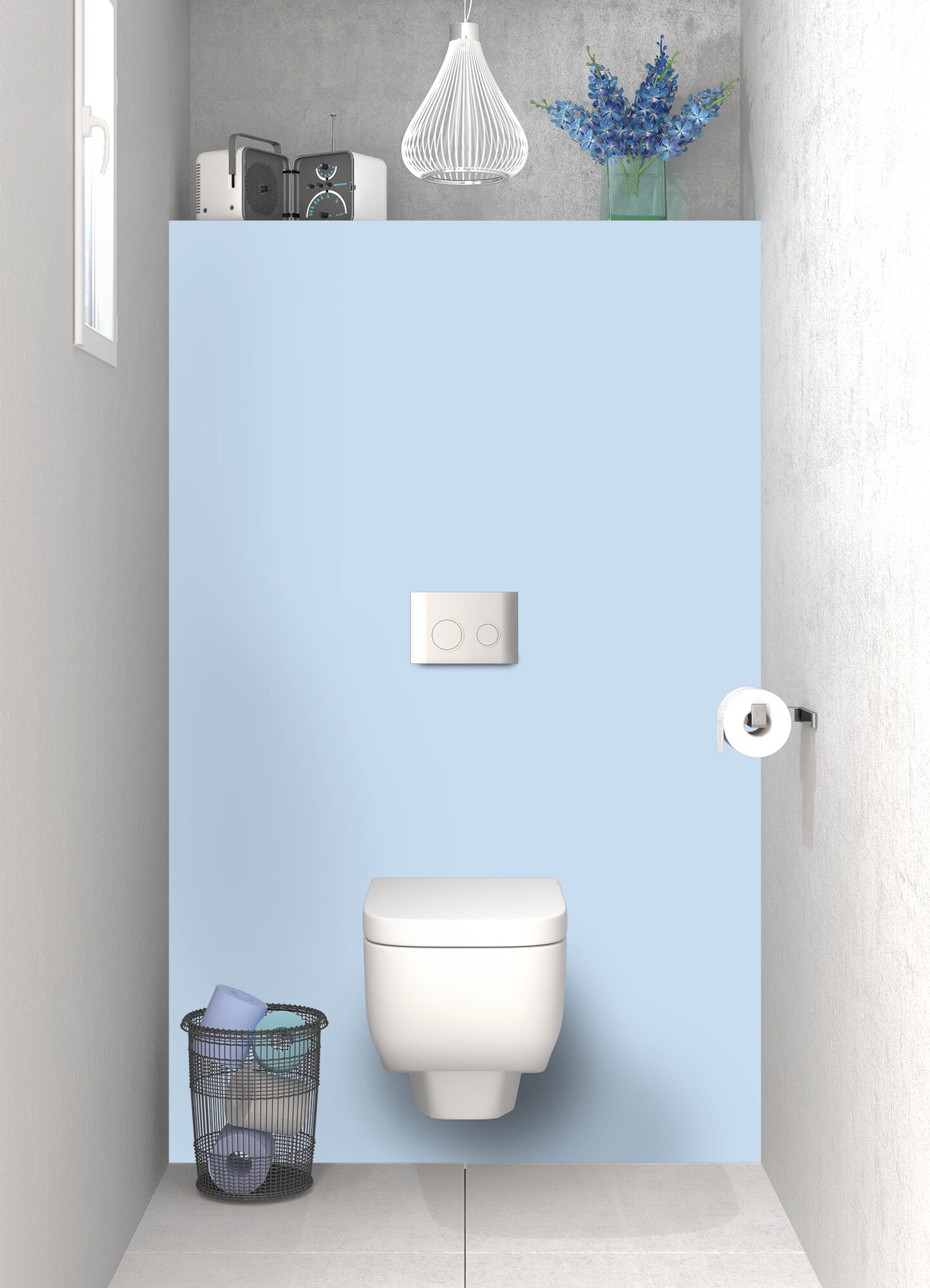 Panneau de toilettes sur mesure, couleur Bleu dragée. Brillant en polycarbonate ou mat en aluminium. Facile à coller sur tous supports.