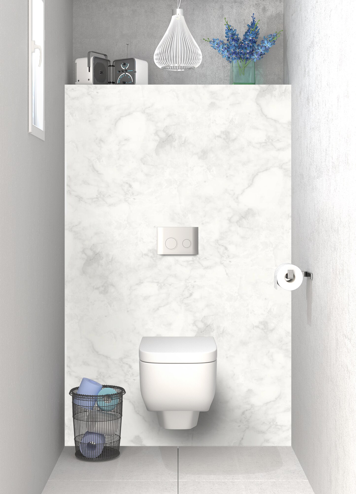 Parez le mur arrière de vos toilettes d'un effet marbre légèrement contrasté aux teintes gris clair et blanc. Disponible en 2 finitions : mat sur aluminium ou brillant en polycarbonate, il s'adapte à tous vos murs et surfaces, y compris en recouvrement d'un ancien carrelage.