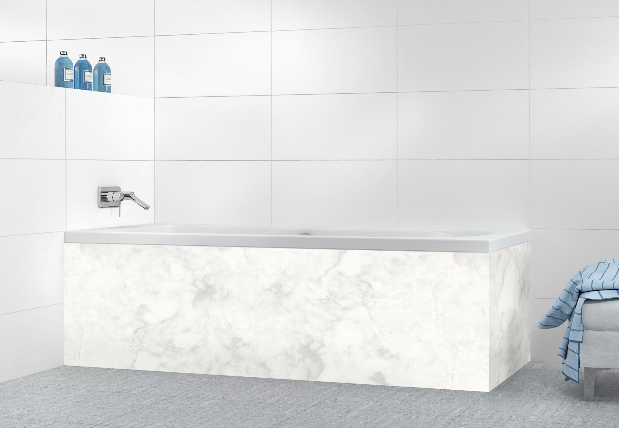 Parez l'habillage de votre baignoire d'un effet marbre légèrement contrasté aux teintes gris clair et blanc. Disponible en 2 finitions : mat sur aluminium ou brillant en polycarbonate, il s'adapte à tous vos murs et surfaces, y compris en recouvrement d'un ancien carrelage.